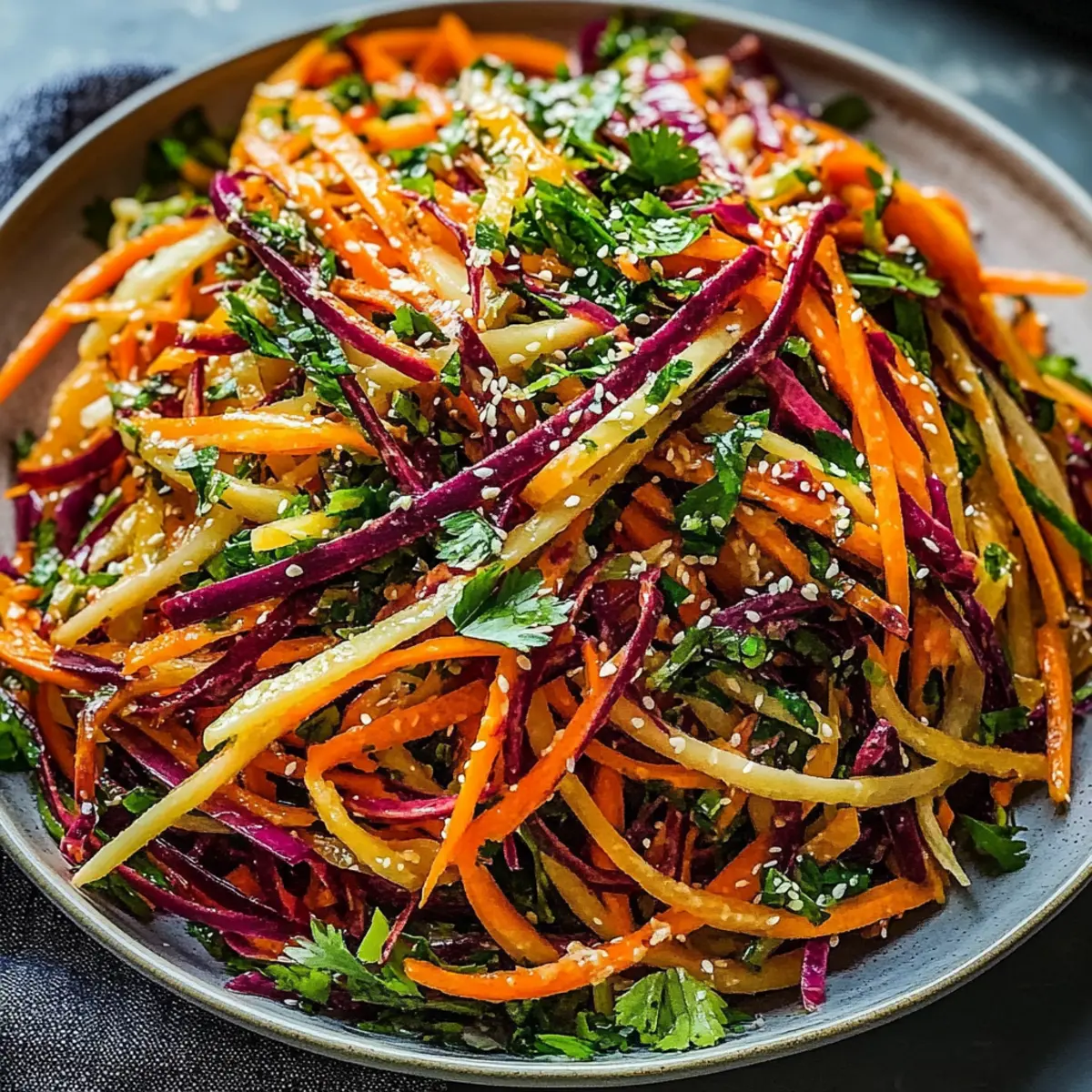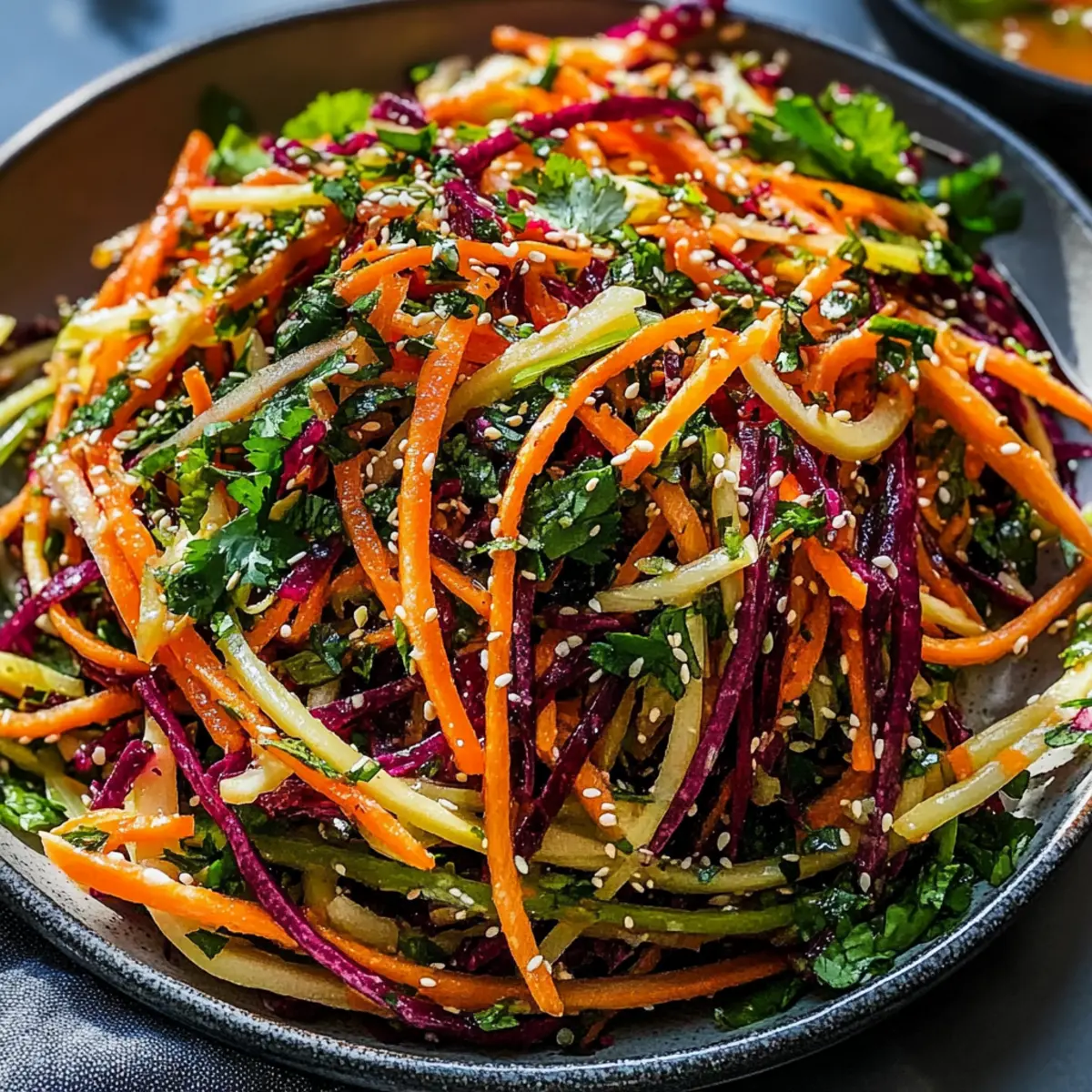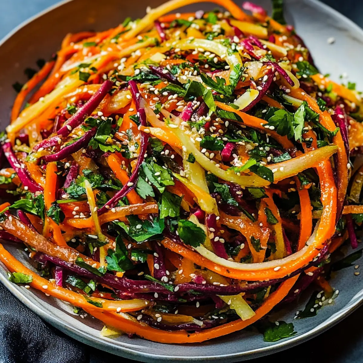 Jump to Recipe Print RecipeAs I was sifting through vibrant farmers’ market produce, the rainbow carrots practically sang to me with their sunny hues. This Shaved Rainbow Carrot Sesame Salad is my delightful response to the mundane mealtime rush, promising both a visually stunning presentation and a burst of refreshing flavor. With its quick prep time and nutritious ingredients, this salad effortlessly adapts to any occasion—whether you’re seeking a light snack or a colorful side for your dinner table. The crunchy texture of the carrots combined with a zesty sesame dressing not only pleases the palate but also keeps your health goals on track. Ready to transform your meals with a vibrant, delicious dish? Let’s dive into the colorful world of this salad together! Why is This Salad So Irresistible? Bursting with Color: This Shaved Rainbow Carrot Sesame Salad is a feast for the eyes, making any meal feel special. Quick Prep Time: With just 20 minutes needed, you can whip up this nutritious delight even on your busiest days. Versatile Flavor Profile: Its zesty sesame dressing complements various dishes—consider serving it alongside grilled chicken or fish for a complete meal. Nutritious and Refreshing: Packed with vitamins and antioxidants, this salad promotes overall health while satisfying your taste buds. Perfect for Meal Prep: Great for make-ahead meals, store leftovers in an airtight container for a quick, crunchy snack later. For more tasty meal ideas, check out our Peach Feta Salad for a sweet twist! Shaved Rainbow Carrot Sesame Salad Ingredients For the Salad • Rainbow Carrots – The colorful base ingredient that brings a crunchy texture and vibrant flair to your Shaved Rainbow Carrot Sesame Salad. • Scallions – Delivers a mild onion flavor; for a sharper bite, use red onions instead. • Cilantro – Imparts an aromatic freshness; if you prefer a milder herb, parsley is a great substitute. • Basil – Adds a sweet, fragrant note; feel free to swap in Italian or Thai basil for a different nuance. For the Dressing • Sesame Oil – Enhances the salad with rich flavor and healthy fats; olive oil is a good alternative for those allergic to sesame. • Rice Vinegar – Contributes tang and brightness; if unavailable, apple cider vinegar works well. • Tamari/Soy Sauce – Brings umami depth to the dressing; choose Tamari for a gluten-free version. • White Miso – Adds creaminess and depth; tahini can serve as a substitute or you can omit it for a lighter taste. • Sriracha – Introduces a kick of heat; adjust to your spice preference or replace it with red pepper flakes. • Coconut Sugar – Provides a touch of sweetness; brown sugar can be used as a substitute if needed. • Garlic – Offers aromatic depth to the dressing; use garlic powder if fresh garlic isn’t on hand. • Ginger – Brightens the dressing with warmth; ground ginger can also work as a handy backup. For Garnishing • Sesame Seeds – Sprinkle them on top for an added crunch and flavor; they’re optional, but highly recommended for that authentic touch. Dive into this indulgent Shaved Rainbow Carrot Sesame Salad experience, and let your taste buds dance with delight! Step‑by‑Step Instructions for Shaved Rainbow Carrot Sesame Salad Step 1: Toast the Sesame Seeds Begin by heating a small skillet over medium heat. Add 1.5 tablespoons of sesame seeds and toast them for 5 to 7 minutes, stirring frequently until they turn golden brown and become fragrant. This step enhances the nutty flavor, adding depth to your Shaved Rainbow Carrot Sesame Salad. Step 2: Prepare the Carrots While the sesame seeds are toasting, wash and peel the rainbow carrots. Using a mandoline or a sharp knife, julienne the carrots into thin strips for a beautiful presentation. Once prepared, transfer them into a large mixing bowl, ensuring they are ready to mingle with the other fresh ingredients. Step 3: Mix in the Vegetables Add 1/4 cup of chopped scallions, 2 tablespoons of cilantro, and 2 tablespoons of basil to the bowl with the rainbow carrots. Gently toss the mixture together until the vegetables are evenly distributed. This colorful combination will bring vibrancy and freshness to your Shaved Rainbow Carrot Sesame Salad. Step 4: Make the Dressing In a blender, combine the rice vinegar, sesame oil, Tamari, white miso, sriracha, coconut sugar, crushed garlic, and ginger. Blend for about 15 to 20 seconds until the dressing achieves a smooth consistency. This zesty dressing will tie together the flavors in your salad perfectly. Step 5: Combine the Salad and Dressing Pour the freshly blended dressing over the carrot mixture in the bowl. Using tongs or salad utensils, carefully toss everything together to ensure each piece is well-coated with the dressing. This step brings the Shaved Rainbow Carrot Sesame Salad to life, melding flavors beautifully. Step 6: Chill the Salad Cover the bowl with plastic wrap or a lid and place it in the refrigerator for at least 1 hour. Chilling allows the flavors to meld, resulting in a more flavorful salad when you’re ready to serve. Trust me, this step is essential to boost the taste of your dish! Step 7: Serve and Garnish Once chilled, remove the salad from the fridge and give it a gentle toss. Before serving, garnish with additional toasted sesame seeds and a sprinkle of red pepper flakes for an extra kick. Your vibrant Shaved Rainbow Carrot Sesame Salad is now ready to delight everyone at the table! Shaved Rainbow Carrot Sesame Salad Variations Feel free to explore these exciting twists that will elevate your Shaved Rainbow Carrot Sesame Salad experience, adding unique flavors and textures! Protein Boost: Add grilled chicken, tofu, or chickpeas for a satisfying protein kick that turns this salad into a hearty meal. Feel free to toss in your favorite protein to make it even more filling. Different Veggies: Substitute rainbow carrots with zucchini or cucumbers for a delicious variat