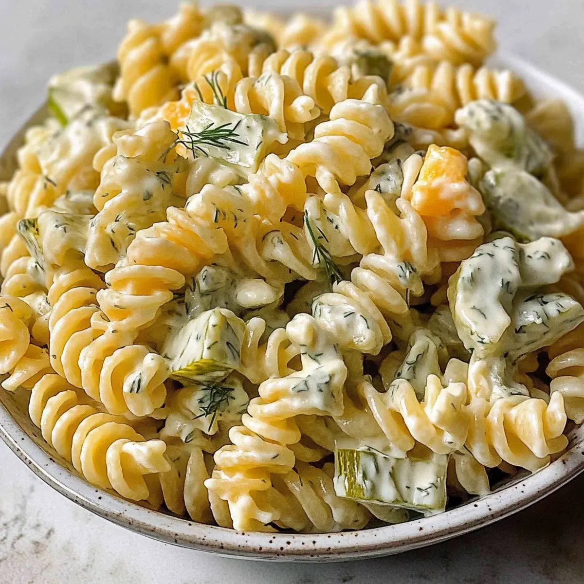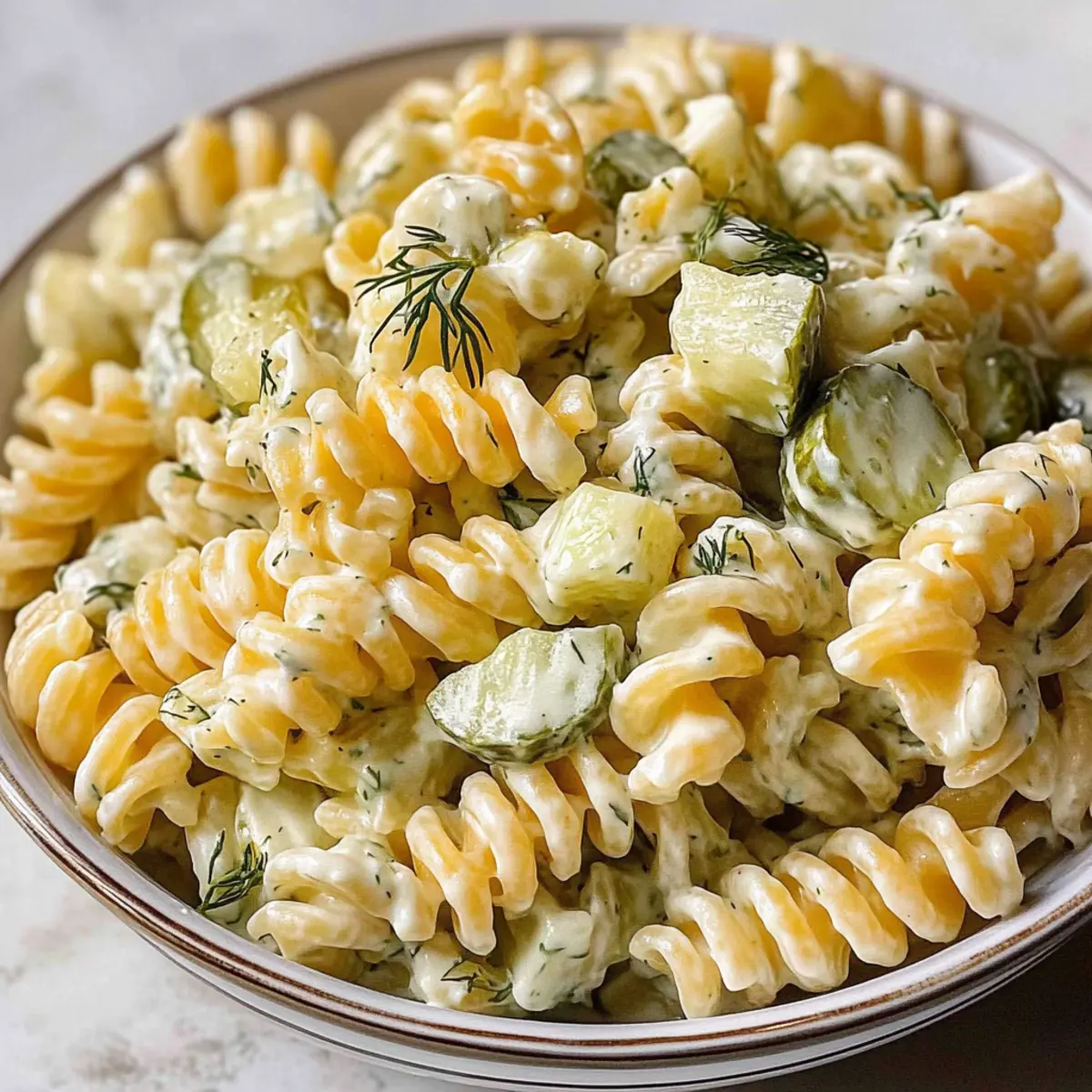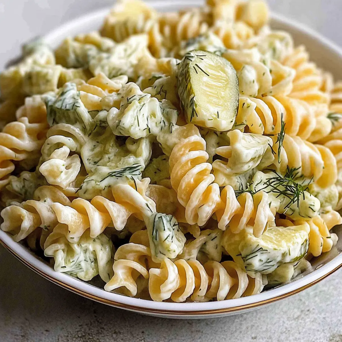 Jump to Recipe Print RecipeThere’s something magical about walking into a summer gathering and immediately catching a whiff of a tangy, creamy pasta salad. It’s like a culinary hug that invites you to partake in the feast. The Simple Dill Pickle Pasta Salad is just that—an effortless way to elevate any meal with its delightful mix of tender rotini, crisp dill pickles, and a refreshingly creamy dressing. One of the best features of this dish is that it’s not only quick to pull together, but it’s also a make-ahead option that becomes even tastier after chilling. Perfect for potlucks or a sunny afternoon barbecue, this crowd-pleaser will have everyone asking for the recipe. Curious how to create this showstopper? Let’s dive into the delicious details! Why is this pasta salad so special? Irresistible Flavor: The combination of tangy dill pickles and creamy dressing creates a flavor explosion that’s sure to satisfy. Quick Preparation: With minimal cooking involved, you can whip this up in no time, leaving you more moments to enjoy your gathering. Make-Ahead Magic: Prepare it a day in advance, allowing the flavors to meld beautifully for a salad that’s even tastier after chilling. Perfect for Any Occasion: Whether you’re hosting a barbecue or attending a potluck, this dish is always a hit, just like our refreshing Street Corn Pasta salad! Versatile Customizations: Feel free to customize with different pasta shapes or cheeses, and let your creativity shine! Kid-Friendly Appeal: Kids love it, making it a fabulous option for family gatherings. Simple Dill Pickle Pasta Salad Ingredients • Make your mouth water with these essentials! For the Pasta Rotini Pasta – Provides structure and holds dressing well; substitute with penne, bow ties, or shells for variety. For the Salad Dill Pickles – Adds tangy crunch; choose your favorite brand for the best brine experience. Colby Jack Cheese – Offers creaminess and flavor; can be swapped with cheddar or a non-dairy cheese for a twist. White Onion – Provides a mild onion taste; replace with green onions for a milder profile. Fresh Dill (or dried dill) – Enhances freshness and flavor; use 1/3 the amount of dried dill if fresh isn’t available. For the Dressing Mayonnaise – Forms the base of the dressing; swap for Greek yogurt for a lighter, tangy flavor alternative. Sour Cream – Adds creaminess to the mix; can be replaced with more mayonnaise or a dairy-free option. Dill Pickle Brine – Infuses flavor and moisture into the pasta; can be increased for extra tangy goodness. Salt & Black Pepper – Essential for seasoning; adjust to taste to bring all flavors together. Now you’re ready to whip up this Simple Dill Pickle Pasta Salad that will quickly become a family favorite! Step‑by‑Step Instructions for Simple Dill Pickle Pasta Salad Step 1: Prep Ingredients Begin by gathering your ingredients. Dice the Colby Jack cheese into small cubes, mince the white onion finely, and chop the dill pickles into bite-sized pieces. Having all your ingredients ready will make the process smoother and ensure that the Simple Dill Pickle Pasta Salad comes together seamlessly. Step 2: Cook Pasta In a large pot, bring salted water to a rolling boil. Add the rotini pasta and cook it for about 8-10 minutes, or until it reaches al dente, which means it should still have a slight bite. Drain the pasta in a colander, then rinse it under cold water for a minute to stop the cooking process and cool it down. Step 3: Brine Pasta Transfer the warm pasta into a large mixing bowl. Pour in a few tablespoons of dill pickle brine while the pasta is still slightly warm. This initial brining infuses the pasta with flavor and moisture, setting the tone for your delicious Simple Dill Pickle Pasta Salad. Toss gently to ensure the pasta is evenly coated. Step 4: Make Dressing In a separate bowl, combine the mayonnaise, sour cream, remaining dill pickle brine, freshly chopped dill, salt, and pepper. Whisk these ingredients together until the mixture is smooth and creamy. Your dressing is crucial for tying all the flavors together, so make sure to achieve a consistent texture. Step 5: Combine Now, add the chopped pickles, diced cheese, and minced onion to the brined pasta. Pour the creamy dressing over this colorful mixture and gently toss everything together until the pasta is thoroughly coated. The vibrant ingredients should be well distributed, creating a delightful medley of flavors for your Simple Dill Pickle Pasta Salad. Step 6: Chill Cover the bowl with plastic wrap or a lid and place it in the refrigerator. Let the salad chill for at least 1-2 hours, allowing the flavors to meld beautifully. The cooling process will enhance the taste and give your Simple Dill Pickle Pasta Salad that satisfying creamy texture perfect for serving at summer gatherings. Expert Tips for Simple Dill Pickle Pasta Salad Perfect Pasta Cooking: Ensure your pasta is cooked al dente, as it will continue to soften while chilling in the dressing, leading to a mushy salad. Rinse with Cold Water: After cooking, rinse the pasta under cold water to stop the cooking process. This will help maintain its texture in the Simple Dill Pickle Pasta Salad. Chill for Best Flavor: Allow the salad to chill for at least 1-2 hours before serving. This extra time lets the flavors meld and enhances the overall taste. Adjust Dressing Consistency: If the salad appears dry after chilling, stir in additional mayonnaise or pickle brine for that extra zing and creaminess. Prep in Advance: Consider making this salad a day ahead of your event. It allows flavors to deepen, making it even more delicious! What to Serve with Simple Dill Pickle Pasta Salad There’s nothing quite like pairing this creamy, tangy delight with complementary flavors and textures for a full, satisfying meal. Grilled Chicken: Juicy and smoky, grilled chicken adds a protein punch that harmonizes beautifully with the creamy pasta. BBQ Ribs: Th