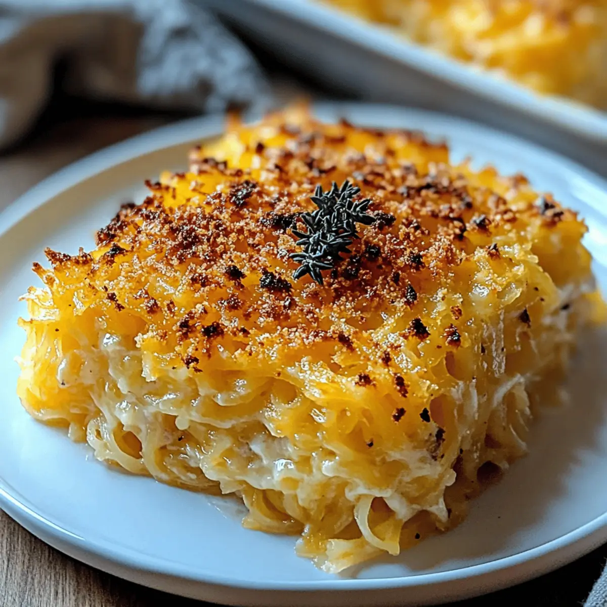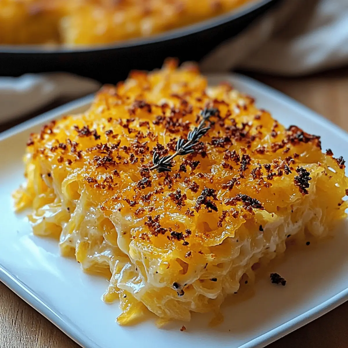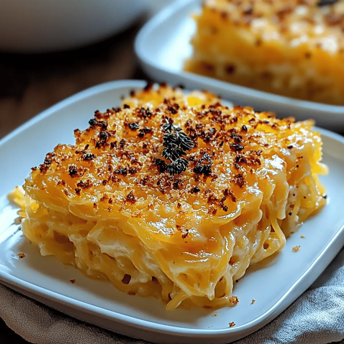 Jump to Recipe Print RecipeAs I stood in the kitchen, the warm aroma of sautéing onions and garlic wrapped around me like a cozy blanket, I knew I was about to create something special. Enter the Spaghetti Squash Au Gratin—a healthy twist on a classic comfort food that’s sure to impress. With the natural sweetness of spaghetti squash encapsulated in a creamy cheese sauce and topped with a crisp, golden crust, this dish blends delicious flavors with guilt-free satisfaction. Perfect for a quick weeknight dinner or an elegant gathering, it’s a crowd-pleaser that doesn’t skimp on comfort. Plus, it’s easily adaptable for vegetarian and gluten-free diets! Are you ready to redefine indulgence? Let’s dive into this savory delight! Why is Spaghetti Squash Au Gratin Amazing? Comforting Indulgence: This dish delivers all the warmth and satisfaction of traditional au gratin recipes, but with a healthy twist that makes it guilt-free. Easy to Make: Whether you’re a seasoned chef or a kitchen novice, the straightforward steps ensure you whip this up with ease. Versatile Options: Feel free to customize it! Add your favorite proteins, like chicken or sausage, or include extra veggies for a heartier meal. Nutritious Choice: Packed with fiber and vitamins from the spaghetti squash, it’s a fantastic way to enjoy a healthy meal without sacrificing flavor. Crowd-Pleasing Flavor: Rich, cheesy goodness topped with a crispy breadcrumb layer makes this dish a surefire hit at any gathering or family dinner. Explore more delightful dishes like these Mini Spaghetti Meatball Bites for more crowd-pleasing ideas! Spaghetti Squash Au Gratin Ingredients • Everything you need for cheesy goodness! For the Base Spaghetti Squash – The star of the dish, offering a tender and subtly sweet texture. Choose one that feels heavy for its size! Unsalted Butter – Adds a rich, creamy flavor; can be replaced with olive oil for a dairy-free option. For the Flavor Yellow Onion – Sautéed to provide savory depth and sweetness; shallots can be a milder alternative. Garlic – Fresh garlic infuses the dish with aromatic notes; garlic powder works in a pinch. For the Sauce All-Purpose Flour – Thicken your cheese sauce effectively; opt for a gluten-free flour blend as a substitute if needed. Whole Milk – Creates a wonderfully creamy base; lower fat can be achieved with 2% or plant-based milk. Nutmeg – A pinch adds warmth and elevates the cheese flavor, making it extra comforting. Salt & Black Pepper – Essential for enhancing flavors; adjust according to your taste preference. For the Cheesy Goodness Gruyere Cheese – Offers a rich, nutty taste that pairs beautifully with the squash; Swiss cheese is a great substitute. Sharp Cheddar Cheese – Brings tanginess and color; mixing different cheddars can add a delightful complexity. Parmesan Cheese – Adds depth and umami; consider nutritional yeast as a vegan alternative if desired. For the Crunchy Topping Panko Breadcrumbs – Provides a satisfying crunch; whole wheat or gluten-free panko can be perfect substitutes. Fresh Parsley – An optional garnish to enhance color and freshness on the plate! With these ingredients ready, you’re well on your way to creating a sensational Spaghetti Squash Au Gratin! Step‑by‑Step Instructions for Spaghetti Squash Au Gratin Step 1: Preheat the Oven Begin by preheating your oven to 400°F (200°C). This temperature is perfect for roasting your spaghetti squash, ensuring it becomes tender and sweet while creating a lovely caramelization. Meanwhile, gather your baking sheet and prepare it for the next step with a bit of non-stick spray or parchment paper for easy cleanup. Step 2: Prepare the Spaghetti Squash Carefully cut the spaghetti squash in half lengthwise and scoop out the seeds using a spoon. Drizzle the cut sides with 2 tablespoons of melted unsalted butter, and season with a sprinkle of salt and black pepper. Make sure the squash is well-coated for optimal flavor, then place it cut-side down on the prepared baking sheet to retain moisture while roasting. Step 3: Roast the Squash Roast the spaghetti squash in your preheated oven for 45–60 minutes, or until the flesh is fork-tender and can easily be shredded into strands. Keep an eye on it towards the end; you want a golden color forming on the skin. Once done, remove it from the oven and set it aside to cool slightly for safe handling. Step 4: Shred the Squash After allowing it to cool for a few minutes, use a fork to carefully shred the spaghetti squash flesh into strands. This process transforms your squash into the noodle-like texture that defines this dish. Set the shredded squash aside in a large mixing bowl and prepare to make the creamy cheese sauce for your Spaghetti Squash Au Gratin. Step 5: Sauté the Aromatics In a medium saucepan, melt the remaining unsalted butter over medium heat. Add the chopped yellow onion and sauté for about 5–7 minutes, stirring occasionally, until it becomes translucent and fragrant. Next, add in the minced garlic and sauté for another minute until it’s aromatic, but be careful not to let it burn! Step 6: Make the Roux Stir in the all-purpose flour to create a roux, cooking for 1-2 minutes while whisking continuously. This step is crucial for thickening your cheese sauce, so make sure the flour is well incorporated and slightly bubbling but not browned. The roux should look smooth and slightly golden, filling your kitchen with a warm, inviting scent. Step 7: Create the Cheese Sauce Gradually whisk in the whole milk, stirring constantly until the mixture is smooth and starts to thicken. Allow it to simmer gently for about 5–7 minutes, keeping an eye on the consistency. It should coat the back of a spoon by this point, becoming a luscious, creamy base for your Spaghetti Squash Au Gratin. Step 8: Cheese It Up Season the sauce with salt, black pepper, and a pinch of nutmeg for added warmth. Reduce the heat to low and stir 