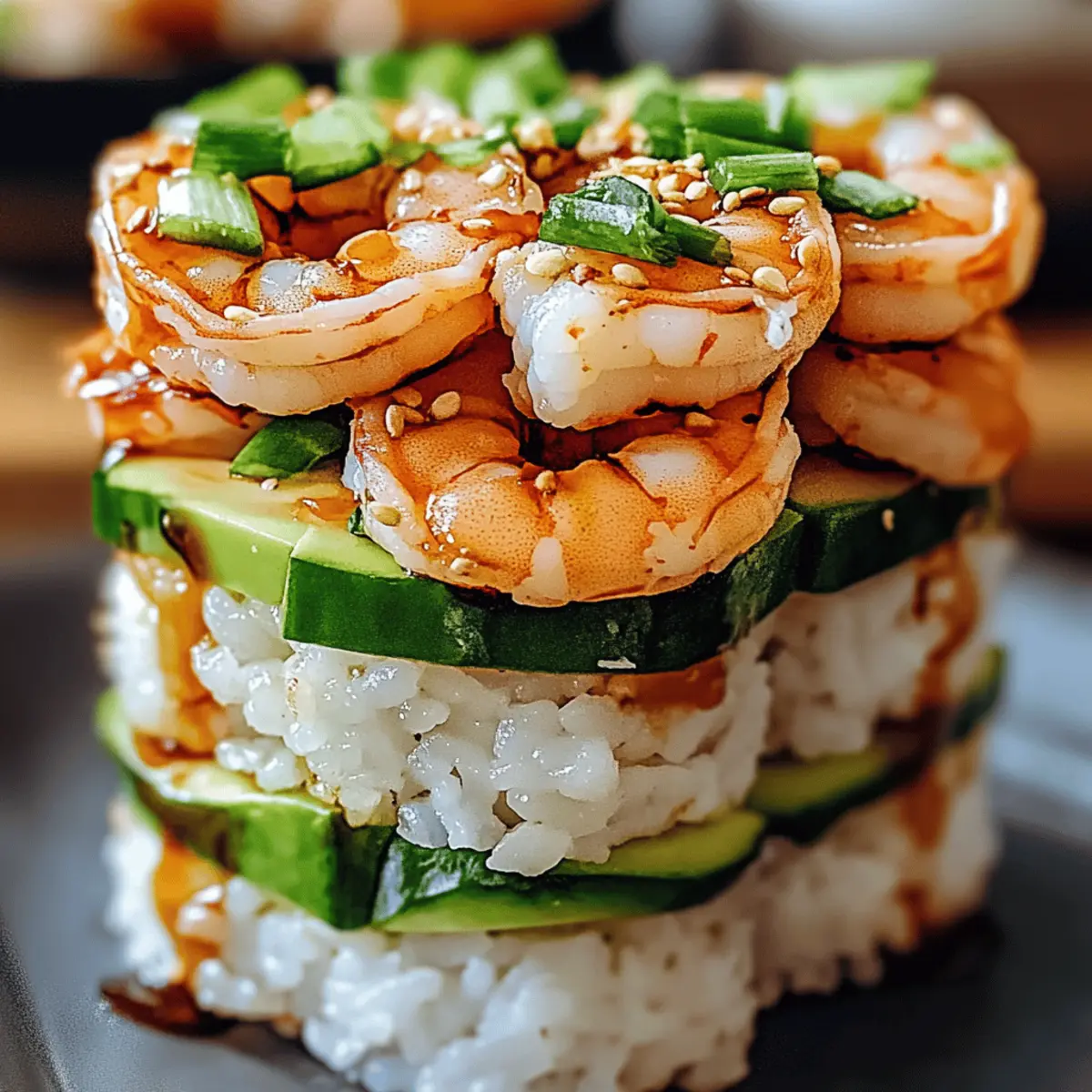 Spicy Shrimp Sushi Stacks are a delightful way to enjoy sushi flavors with succulent shrimp, spicy glaze, creamy avocado, and crunchy cucumber.