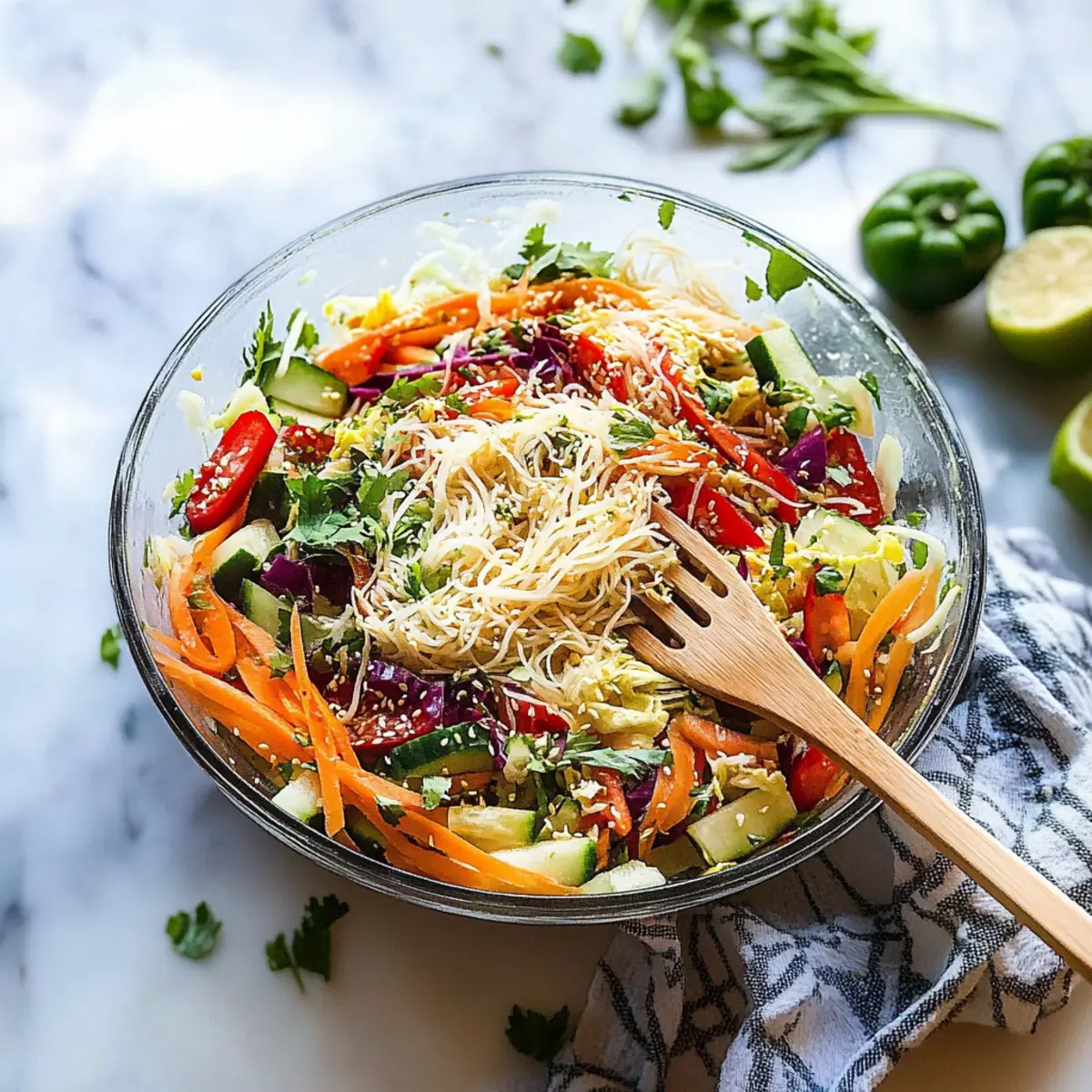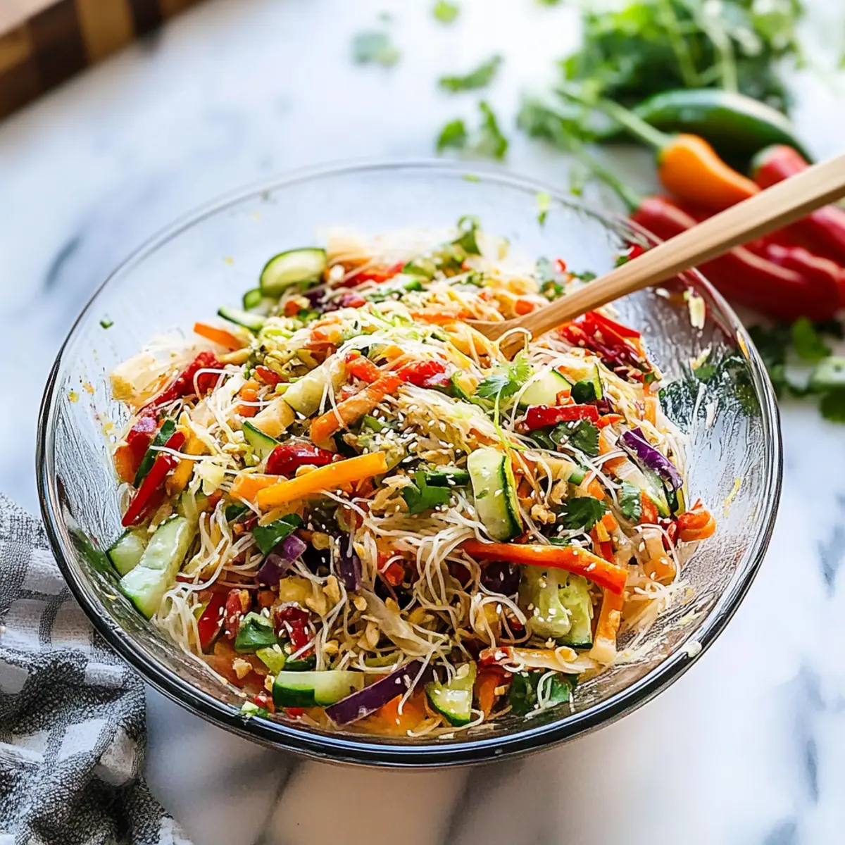 Jump to Recipe Print RecipeAs I stood amidst a vibrant farmer’s market, the brilliant colors of fresh vegetables called to me like an artist’s palette. That’s when the idea for my Rainbow Spring Roll Salad with Spicy Ginger Dressing came alive—a dazzling mix of crisp veggies tossed with tender rice noodles and drizzled with a kick of spicy ginger. Not only is this salad a feast for the eyes, but it’s also super easy to whip up, making it a perfect option for a quick lunch or a standout side at your next gathering. Best of all, it’s healthy, vegan, and gluten-free, so you can enjoy it without any guilt. Are you ready to explore this colorful, flavorful creation together? Why is this Spring Roll Salad special? Vibrant Colors: The colorful medley of fresh veggies is sure to brighten up any meal. Easy Preparation: With minimal ingredients and straightforward steps, this recipe comes together in no time. Zesty Flavor: The spicy ginger dressing adds a delightful kick that complements the crisp salad perfectly. Healthy Option: Enjoy a nutritious mix that is vegan and gluten-free, perfect for any dietary preference. Endless Customization: Feel free to add your favorite ingredients, like grilled chicken or tofu for a protein boost. Perfect for lunch or as a refreshing side, just like my Summer Berry Salad or Cinnamon Roll Muffins. Dive into a bowl of flavor now! Spring Roll Salad Ingredients • Here’s everything you need for the vibrant Spring Roll Salad with Spicy Ginger Dressing! For the Spicy Ginger Dressing Minced Fresh Ginger – Adds a robust, spicy flavor; fresh is preferred for taste. Minced Garlic – Provides aromatic depth; fresh garlic is ideal, but garlic powder may be used. Soy Sauce – Adds umami and saltiness; substitute tamari for a gluten-free option. Agave Nectar – Sweetness to balance the spice; honey or maple syrup works as alternatives. Rice Wine Vinegar – Offers a tangy acidity; apple cider vinegar can be used for a different profile. Sesame Oil – Lends a nutty aroma and depth of flavor; can substitute with any neutral oil if necessary. Canola or Vegetable Oil – Provides a base for the dressing; avocado oil is a good alternative. Red Pepper Flakes – Adds heat; adjust according to spice preference—omit if sensitive to spice. For the Spring Roll Salad Rice Noodles – Tender base of the salad; cook according to package instructions and rinse with cold water. Shredded Cabbage – Crunchy texture; kale or mixed greens are great substitutes. Cucumber (julienned) – Fresh, crisp element; ensure even cuts for optimal texture. Carrots (julienned) – Adds sweetness and color; shredded or thinly sliced bell peppers can be used instead. Sweet Pepper (julienned) – Provides sweetness and vibrant color; any variety can work for different sweetness levels. Minced Cilantro and Mint – Fresh herbs for added flavor; basil or parsley can be alternatives for those sensitive to cilantro. Chopped Roasted Peanuts – Crunchy addition for texture; omit for nut-free options or substitute with seeds. Optional Garnishes – Additional cilantro and sesame seeds for a finishing touch. Step‑by‑Step Instructions for Spring Roll Salad with Spicy Ginger Dressing Step 1: Prepare the Spicy Ginger Dressing In a blender, add 2 tablespoons of minced fresh ginger, 1 tablespoon of minced garlic, ¼ cup soy sauce, 2 tablespoons agave nectar, ¼ cup rice wine vinegar, 2 tablespoons sesame oil, 2 tablespoons canola oil, and ½ teaspoon red pepper flakes. Blend on high until smooth and creamy, about 30 seconds. Taste and season with salt and pepper to your preference, setting it aside to let the flavors mingle while you prep the salad. Step 2: Cook the Rice Noodles Bring a pot of water to a rolling boil, then add 8 ounces of rice noodles. Cook according to package instructions, usually 4-6 minutes, until al dente. Once cooked, drain the noodles and rinse them under cold water for a minute to stop the cooking process and cool them down, allowing them to retain their chewy texture in your fresh Spring Roll Salad. Step 3: Chop Your Vegetables While the noodles are cooking, prepare your vegetables for the salad. Shred 2 cups of cabbage, julienne 1 cucumber, 1 large carrot, and 1 sweet pepper, ensuring all pieces are uniformly cut for even texture. Gather ¼ cup of minced cilantro and mint. These fresh ingredients will bring vibrant colors and flavors to your Spring Roll Salad, making it as eye-catching as it is delicious. Step 4: Assemble the Salad In a large mixing bowl, combine your cooled rice noodles, shredded cabbage, julienned cucumber, carrots, sweet pepper, and the minced herbs. Gently toss the ingredients together with your hands or tongs until well mixed, creating a colorful medley that forms the base of your Spring Roll Salad—this blend of textures will make every bite delightful. Step 5: Dress the Salad Just before serving, pour your Spicy Ginger Dressing over the salad mixture. Use tongs to toss everything together until all of the ingredients are evenly coated with the zesty dressing. This quick step ensures every bite of your Spring Roll Salad bursts with that delicious, spicy flavor you’ve prepared, enhancing the freshness of the vegetables. Step 6: Garnish and Serve Transfer the beautifully mixed salad onto a serving platter or individual bowls. Top each portion with ¼ cup of chopped roasted peanuts for a crunchy finish, and sprinkle extra cilantro and sesame seeds as optional garnish. Serve immediately to enjoy the crispness of the vegetables and the vibrant flavors of your Spring Roll Salad with Spicy Ginger Dressing. Make Ahead Options These Rainbow Spring Roll Salads with Spicy Ginger Dressing are perfect for meal prep enthusiasts! You can prepare the salad components—shredded cabbage, julienned cucumber, carrots, and peppers—up to 3 days in advance. Simply store them in airtight containers in the refrigerator to maintain their crispness. The spicy ginger