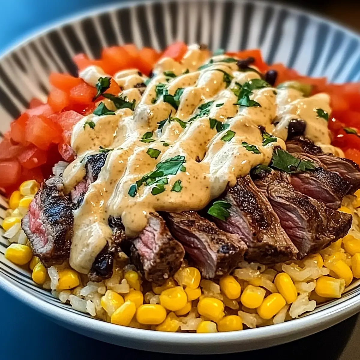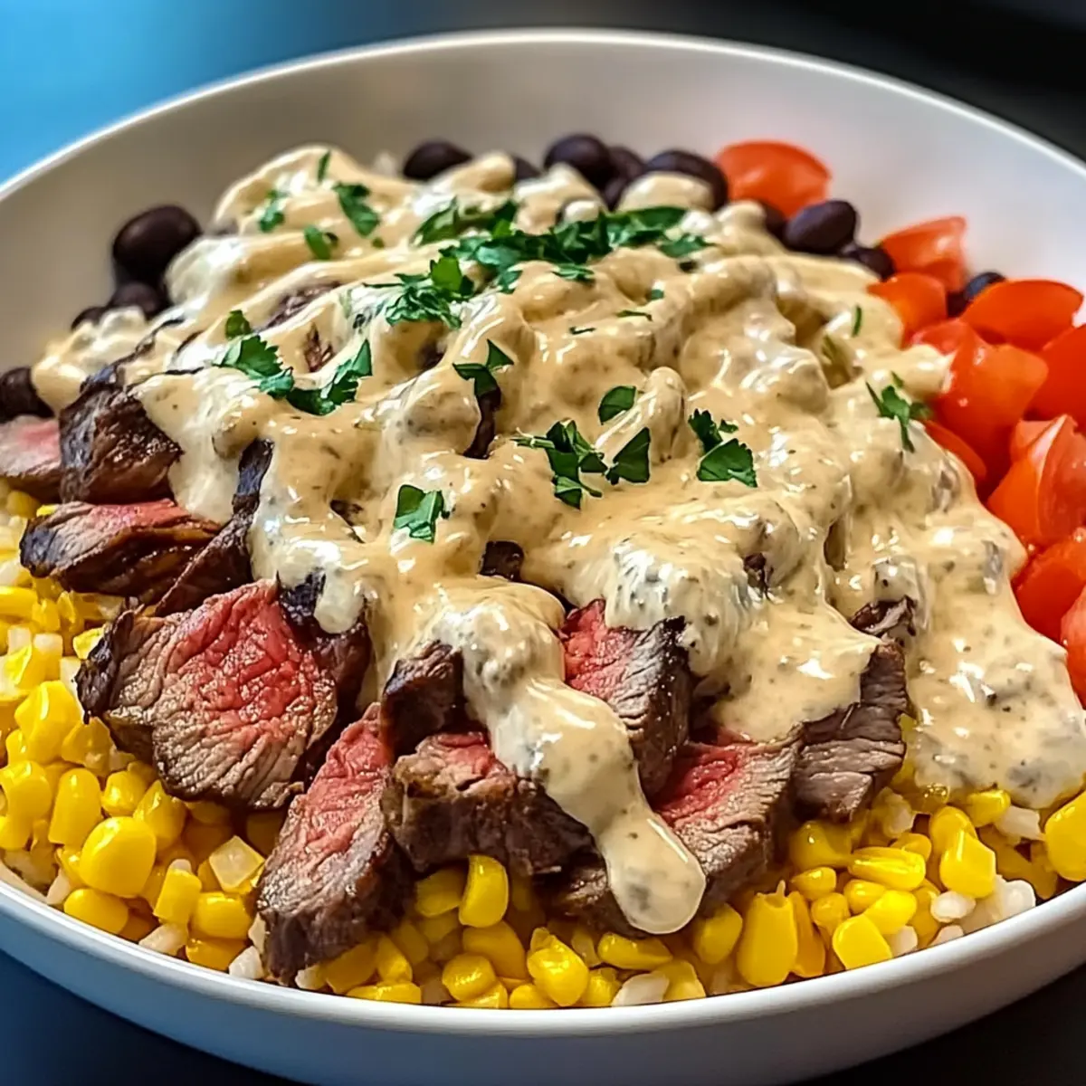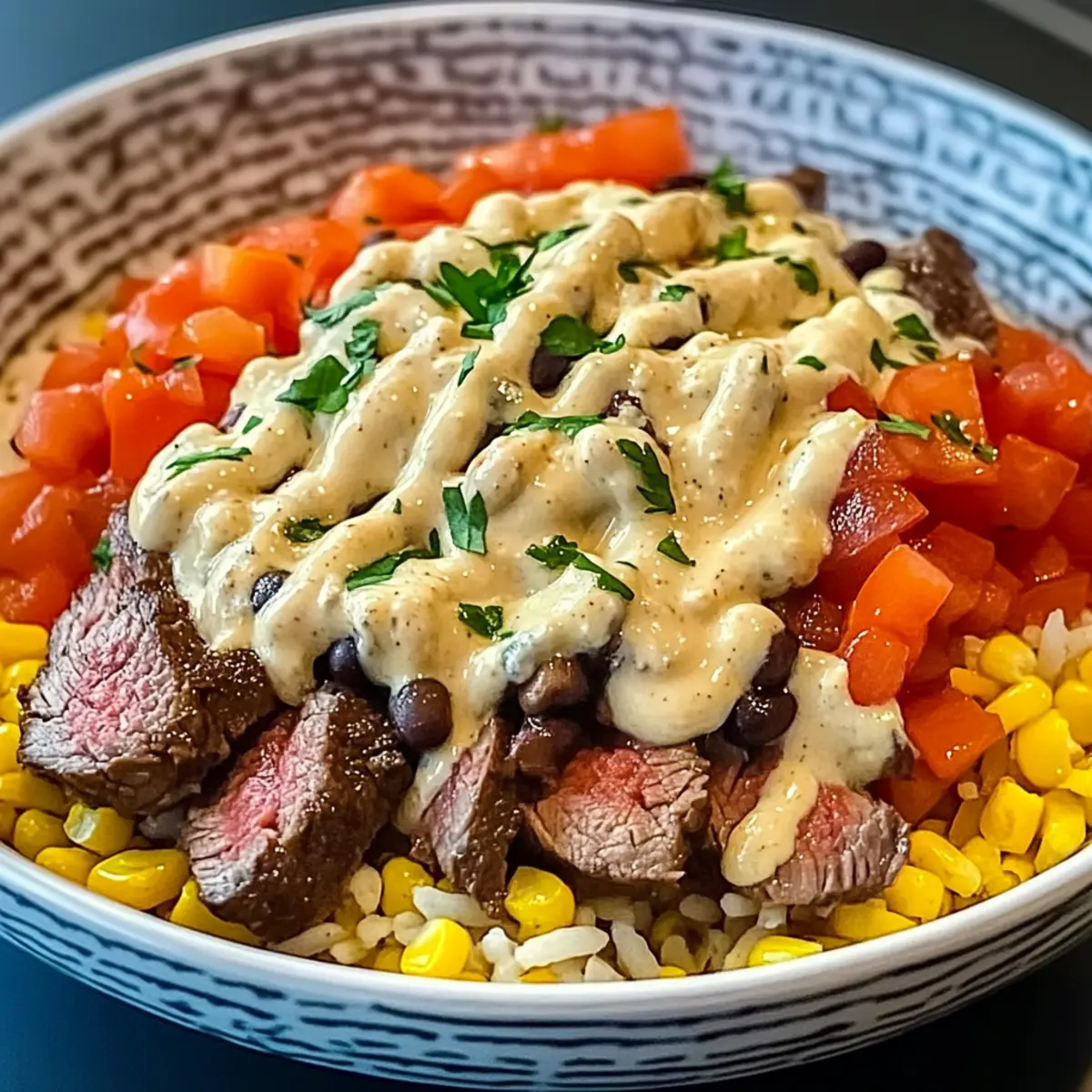 Jump to Recipe Print RecipeYou know that feeling when dinner time rolls around and you realize you’ve hit a culinary wall? Enter the Steak Queso Rice Bowl—a solution that not only breaks the monotony but brings exciting flavors to your table in just 25 minutes. Imagine tender, juicy flank steak nestled on a fluffy bed of rice, generously drizzled with creamy queso and topped with colorful, fresh ingredients. This dish is not only quick to prepare but also incredibly customizable, making it a true crowd-pleaser—perfect for both busy weeknights and cheerful gatherings. Whether you prefer grilled chicken, spicy shrimp, or even a vegetarian twist with tofu, this recipe allows you to let your creativity shine. Ready to transform your dinner routine? Let’s dive into creating this delicious masterpiece! Why is This Recipe a Must-Try? Quick and Easy: This Steak Queso Rice Bowl can be whipped up in just 25 minutes, making it perfect for busy weeknights or last-minute gatherings. Customizable Delight: With options for flank steak, grilled chicken, shrimp, or even tofu, you can cater to everyone’s tastes and dietary needs. Flavor Explosion: Rich queso meets savory spices and fresh ingredients, creating a mouthwatering blend that’s sure to impress. Nutrient-Packed: Loaded with protein and veggies, it’s a satisfying meal that’s not just delicious but wholesome too. Family-Friendly: This dish pleases all ages, making it ideal for family dinners or casual get-togethers with friends. For more quick meal ideas, check out my Garlic Butter Steak Bites and Potatoes or Honey BBQ Chicken Rice! Steak Queso Rice Bowl Ingredients For the Rice Base • Cooked white rice – The perfect fluffy base; swap for brown rice for added nutrition. For the Protein • Flank steak – Tender and flavorful; try grilled chicken, shrimp, or tofu as alternatives. For Cooking • Olive oil – Adds richness when cooking; can be substituted with any cooking oil of your choice. For the Spices • Chili powder – Imparts warmth and depth; smoked paprika can give a slightly different twist. • Cumin – Brings an earthy flavor; swap with coriander for a milder note. • Garlic powder – Enhances savory richness, or opt for fresh garlic for a bolder taste. • Onion powder – Adds umami goodness; fresh onions can be included for a fresher flavor. • Salt and pepper – Essential seasonings; adjust to your preferred taste for the best Steak Queso Rice Bowl experience. For the Creamy Element • Queso cheese sauce – The crowning glory of this dish; ensure it’s gluten-free if needed. For the Extras • Black beans – A hearty source of protein and fiber; kidney beans work well if needed. • Corn – Sweet and crunchy; use fresh or canned based on availability. • Diced tomatoes – Brightens the dish with freshness; swap with salsa for a flavorful twist. • Avocado – Creamy and nutritious; replace with sour cream if there’s an allergy. • Chopped fresh cilantro – A burst of freshness; can be omitted for those who aren’t fans of cilantro. • Lime wedges – Add a zesty kick to balance the flavors; essential for the final touch. Step‑by‑Step Instructions for Steak Queso Rice Bowl Step 1: Prepare the Steak Heat 2 tablespoons of olive oil in a large skillet over medium-high heat until shimmering. Add the sliced flank steak, seasoning it generously with chili powder, cumin, garlic powder, onion powder, salt, and pepper. Cook for 5-7 minutes, stirring occasionally, until the steak is nicely browned and just cooked through. Once done, transfer the steak to a plate and let it rest for a few minutes. Step 2: Warm the Queso In a small saucepan, pour in the queso cheese sauce and warm it over low heat, stirring occasionally. Aim for a smooth and creamy consistency, taking about 3-5 minutes. Ensure you keep an eye on it to prevent burning; the goal is to have it ready to drizzle over your Steak Queso Rice Bowl just as your rice and steak finish cooking. Step 3: Mix the Rice and Beans In a large bowl, combine 2 cups of cooked white rice, 1 can of drained black beans, 1 cup of corn, and 1 cup of diced tomatoes. Gently mix everything together until well combined, ensuring that the rice forms a hearty base for your bowl. This mixture provides a delightful blend of textures and flavors for your Steak Queso Rice Bowl. Step 4: Assemble Your Bowls Divide the rice and bean mixture evenly into serving bowls, creating a generous base. Next, slice the rested flank steak against the grain into thin strips and layer it atop the rice mixture. Drizzle the warm queso cheese sauce generously over the steak to enrich the entire dish with its creamy goodness. Step 5: Add the Fresh Toppings Top each bowl with diced avocado for creaminess and a handful of chopped fresh cilantro for brightness. For an extra layer of flavor, serve with lime wedges on the side, allowing each person to add a zesty kick to their Steak Queso Rice Bowl. Enjoy your vibrant creation, perfect for any meal! Storage Tips for Steak Queso Rice Bowl Room Temperature: Serve immediately after preparation for optimal flavor and freshness. Do not leave out for more than 2 hours to ensure food safety. Fridge: Store leftover components in airtight containers for up to 3 days; keep rice, steak, and toppings separate to maintain texture and taste. Freezer: You can freeze the rice and cooked steak separately for up to 2 months. Thaw overnight in the fridge before reheating. Reheating: For best results, reheat the rice and steak in a skillet over medium heat, adding a splash of water if needed to rehydrate. Warm the queso sauce gently on the stove, stirring until smooth before drizzling. What to Serve with Steak Queso Rice Bowl? Creating a satisfying meal is easy when you know the perfect pairings to complement your delicious creation. Tortilla Chips: The crunchy texture and salty flavor enhance every bite, making them a perfect appetizer or side. Fresh Garden Salad: A