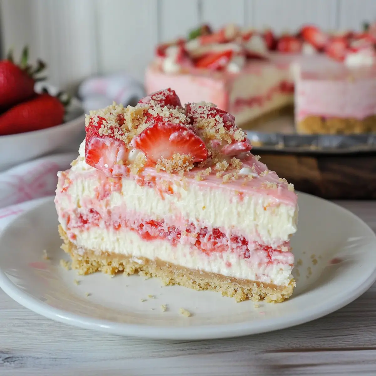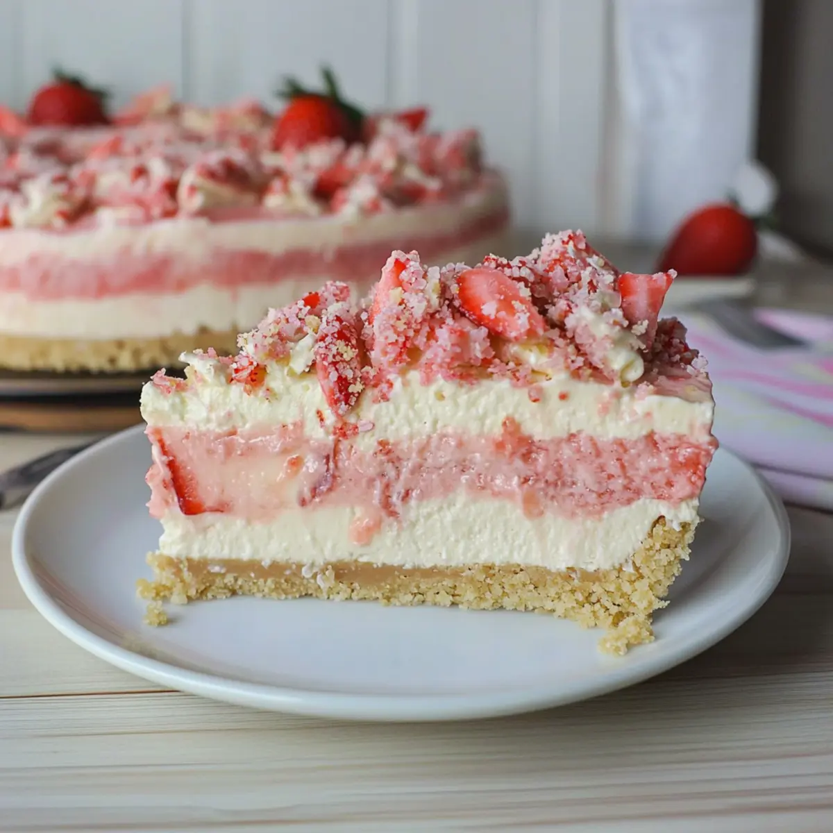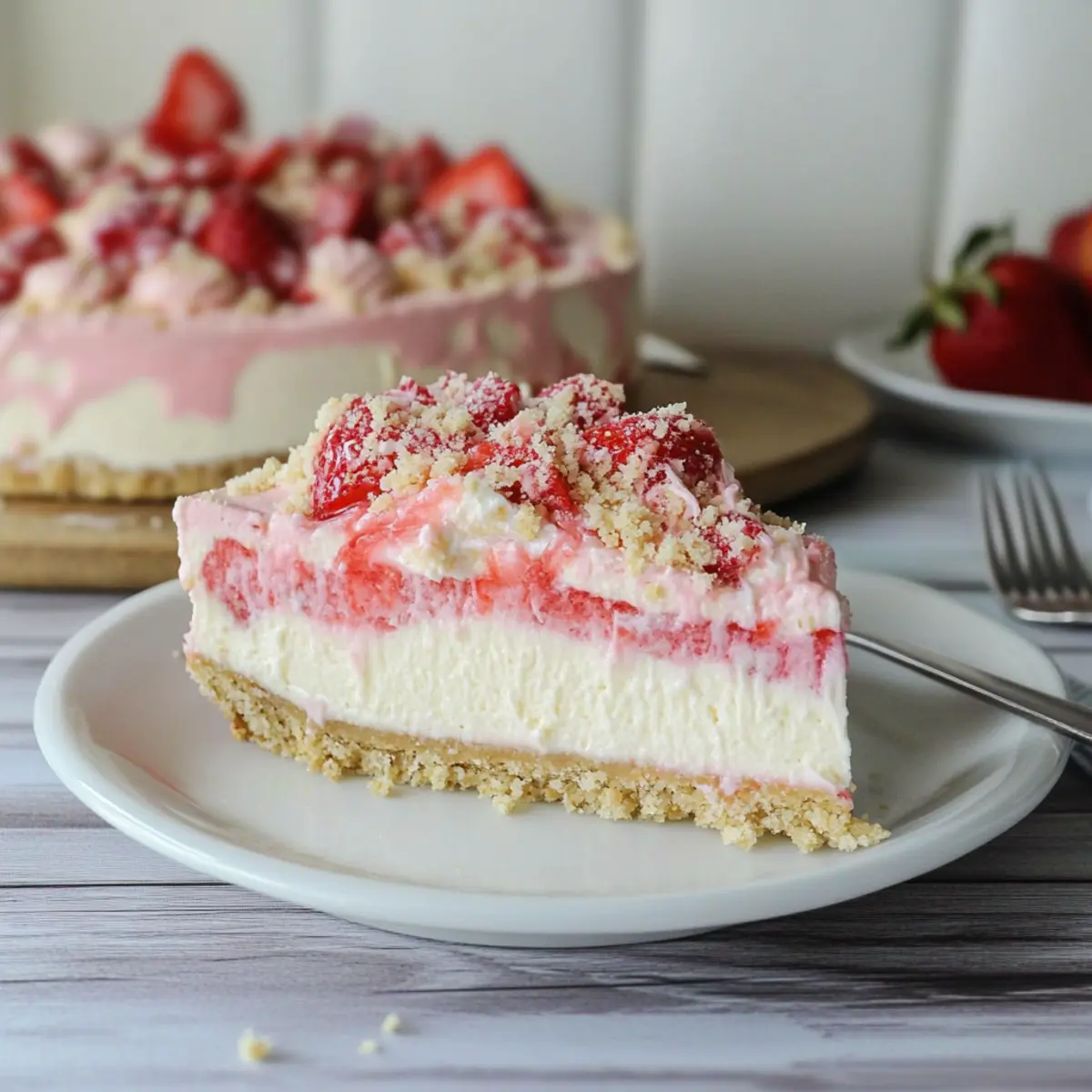 Jump to Recipe Print RecipeA swirl of nostalgia fills the air as summer settles in, and my mind races back to the joyous moments shared over sweet indulgences. Today, I’m excited to share my No-Bake Strawberry Crunch Cheesecake recipe, a delightful blend of creamy cheesecake and a satisfying crunch that promises to transport you to blissful sunshine-filled afternoons. This dessert not only comes together without the need for an oven, making it a breeze in warm weather, but it also serves as a refreshing crowd-pleaser for any gathering. Trust me, your friends and family will be begging for seconds! Are you ready to whip up a slice of summer magic? Let’s dive in! Why is This Cheesecake So Irresistible? Creamy Delight: This No-Bake Strawberry Crunch Cheesecake is a luscious treat, combining rich cream cheese with a light, fluffy texture that will make your taste buds dance. Effortless Preparation: With no oven required, you can whip up this dessert quickly, making it ideal for those busy summer days. Summer Refreshment: The sweet strawberry flavor paired with a crunchy cookie crust brings the essence of summertime to every bite, perfect for picnics and barbecues. Crowd-Pleasing: Whether you’re hosting a gathering or just treating your family, this cheesecake will impress everyone and leave them coming back for more. Versatile Options: Feel free to mix things up! Swap strawberries for your favorite fruit or get inspired by my Blueberry Crumble Cheesecake for another refreshing twist. Get ready to savor this blissful dessert that combines ease, flavor, and a touch of nostalgia! Strawberry Crunch Cheesecake Ingredients For the Crust • Vanilla Cookies – The perfect base for a crumbly, buttery crust; you can swap these for graham crackers for a unique taste. • Butter – Unsalted is preferred to maintain the sweetness balance; feel free to use salted butter if that’s what you have. For the Cheesecake Filling • Gelatin (unflavored) – Essential for setting the cheesecake without baking; avoid agar as it behaves differently. • Cream Cheese – Use full-fat for a rich and creamy texture that holds its shape beautifully; low-fat may compromise that creaminess. • Granulated Sugar – Sweetens the filling perfectly; substitute with powdered sugar for even smoother cheesecake. • Heavy Whipping Cream – Whip this up for that airy texture; you can use whipped topping if you’re short on time. • Powdered Sugar – Adds a touch of sweetness to the whipped cream; can be omitted for a less sweet outcome. • Strawberry Gelatin – Boosts the strawberry flavor, but fresh strawberry puree offers a more natural taste with a bit of cornstarch for thickening. For the Topping • Strawberry Wafers – Crushed and sprinkled on top for an added crunch; switch to nuts if you prefer a different texture. Get ready to create this delightful Strawberry Crunch Cheesecake, perfect for your summer celebrations! Step‑by‑Step Instructions for Strawberry Crunch Cheesecake Step 1: Prepare the Crust Begin by processing 26 vanilla cookies in a food processor until they become fine crumbs. In a mixing bowl, combine the cookie crumbs with melted unsalted butter, stirring until well blended. Press this mixture evenly into the bottom of a greased 10-inch springform pan, taking care to create a compact layer. Place the crust in the freezer for 15 minutes to firm up. Step 2: Make the Cheesecake Filling In a small bowl, dissolve the unflavored gelatin in boiling water, stirring until completely dissolved; set aside to cool slightly (do not refrigerate). Meanwhile, in a medium mixing bowl, beat the cream cheese and granulated sugar together using an electric mixer until the mixture is smooth and creamy, approximately 2-3 minutes. In a separate bowl, whip the heavy cream with the powdered sugar until stiff peaks form, which should take about 4-5 minutes. Step 3: Combine Mixtures Gently fold half of the whipped cream into the cream cheese mixture using a spatula, allowing the textures to blend smoothly. Next, incorporate the cooled strawberry gelatin into the remaining whipped cream, folding carefully to maintain airiness. This step ensures that the Strawberry Crunch Cheesecake filling is light and fluffy, harmonizing beautifully with the berry flavor. Step 4: Assemble the Cheesecake Pour half of the strawberry mixture over the prepared crust in the springform pan, smoothing it out into an even layer. Return this to the freezer and let it set for another 15 minutes. Once firm, add the cream cheese mixture on top, followed by the remaining strawberry mixture, spreading it evenly for a beautiful layered effect. Step 5: Prepare the Topping While the cheesecake sets, crush the remaining vanilla cookies and strawberry wafers in a bowl until you achieve a fine consistency. If desired, add a drop of red food coloring to enhance the visual appeal. Afterward, sprinkle this mixture generously over the top of the cheesecake, adding a delightful crunch that complements the creamy layers beneath. Step 6: Chill Transfer your assembled Strawberry Crunch Cheesecake to the refrigerator and allow it to chill for at least 4 hours, or ideally overnight. This chilling time is essential for the cheesecake to fully set and meld its flavors, resulting in a smooth, creamy dessert that slices beautifully. Step 7: Serve Just before serving, consider topping the cheesecake with an extra layer of whipped topping for added sweetness and décor. Slice the cheesecake with a sharp knife dipped in warm water for clean cuts, ensuring each slice reveals its tempting layers. Gather your loved ones, serve this delightful Strawberry Crunch Cheesecake, and relish in the joy of sharing a truly special treat! Make Ahead Options These No-Bake Strawberry Crunch Cheesecake preparations are perfect for busy home cooks looking to streamline their meal planning! You can prepare the crust and cheesecake filling up to 24 hours in advance. Simply make the cru