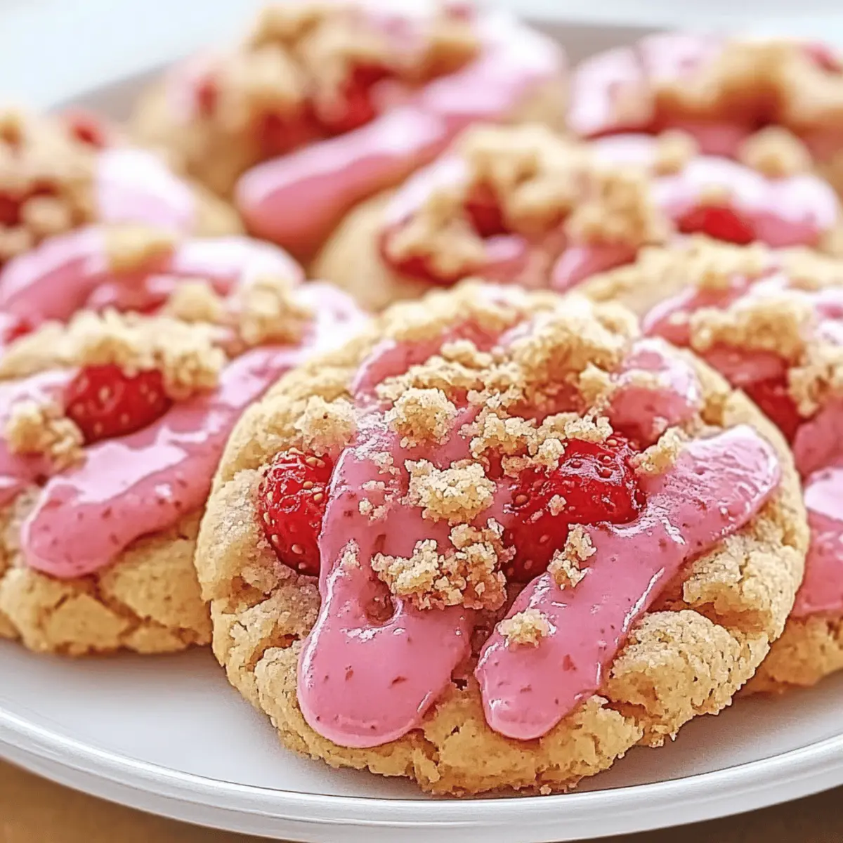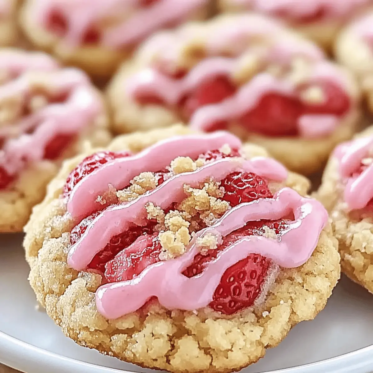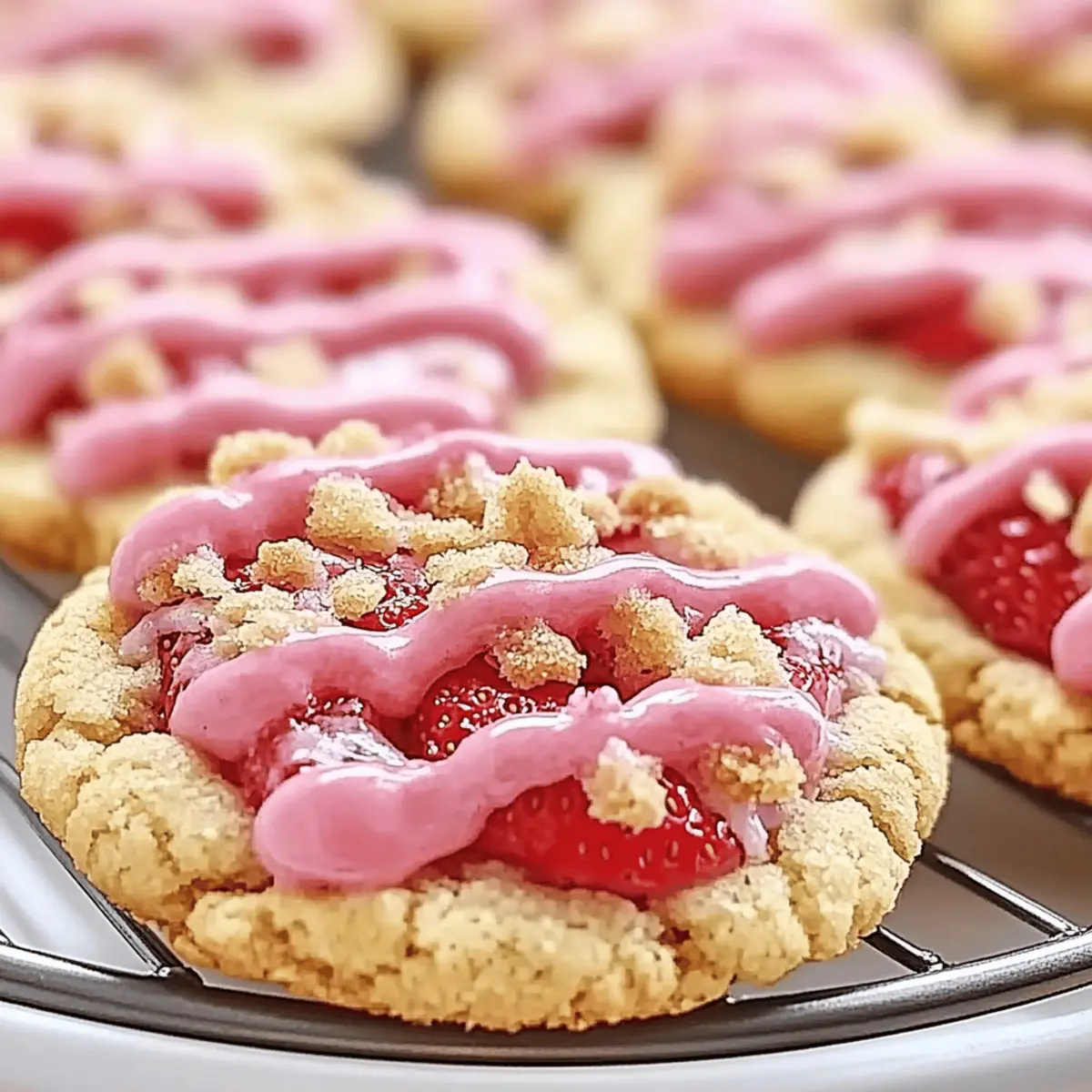 Jump to Recipe Print RecipeStanding in my kitchen, the air fills with the sweet, fruity scent of strawberries and buttery dough, instantly whisking me away to sun-soaked picnics. Today, I’m excited to share my beloved recipe for Strawberry Crunch Cookies, a delightful blend of soft, chewy centers and a crunchy topping that makes every bite a celebration of summer. Each cookie is not only a treat for the senses but also a quick dessert option that’s perfect for gatherings, ensuring that you’ll have extra time to enjoy with friends and family. Plus, with just a handful of simple ingredients, it’s easy to whip up a batch whenever a craving hits. Ready to elevate your cookie game and create some nostalgia in your kitchen? Let’s dive into the sweet and crunchy world of Strawberry Crunch Cookies! Why Are Strawberry Crunch Cookies So Irresistible? Bursting with Flavor: Every bite offers a delightful mix of fruity strawberry and creamy white chocolate, ensuring a taste that resonates with everyone. Easy to Make: With simple ingredients and minimal steps, you’ll impress your friends and family without spending hours in the kitchen. Perfect for Any Occasion: These cookies are not just desserts; they bring joy to picnics, parties, and everyday treats, fitting seamlessly into any gathering. Nostalgic Appeal: The combination of soft centers and crunchy cereal topping takes you back to sunny days, making them perfect for sharing those sweet summer vibes. Versatile Options: Experiment with variations, such as substituting crushed graham crackers for a different crunch or trying other fruit-flavored cereals for a unique twist. You can also check out other delightful recipes like Strawberry Crunch Cheesecake for more fruity goodness! Strawberry Crunch Cookies Ingredients For the Cookie Base Unsalted Butter – Provides creaminess and richness; you can use salted butter, omitting added salt. Granulated Sugar – Adds sweetness and helps achieve a light texture; no direct substitution. Brown Sugar – Introduces moisture and enhances chewiness; consider using dark brown sugar for a deeper flavor. Egg – Acts as a binding agent; for vegan options, replace with flax egg or applesauce. Vanilla Extract – Adds depth of flavor; try substituting with almond extract for a twist. All-Purpose Flour – Provides structure; gluten-free flour works as a substitute. Baking Soda – A leavening agent that helps the cookies rise; no direct substitution. Salt – Balances sweetness; leave it out if using salted butter. For the Strawberry Crunch Strawberry Jam – Supplements fruit flavor and moisture; opt for high-quality or homemade jam for the best taste. Crushed Strawberry-Flavored Cereal – Adds crunch and fruity flavor; you can replace it with crushed cornflakes mixed with a few drops of strawberry extract. White Chocolate Chips – Provides sweetness and creaminess; swap with dark chocolate or omit for fewer calories. With these Strawberry Crunch Cookies ingredients, you’re ready to create a batch that will surely become a family favorite! Step‑by‑Step Instructions for Strawberry Crunch Cookies Step 1: Preheat and prep Start by preheating your oven to 350°F (175°C). While it’s warming up, line your baking sheets with parchment paper to ensure your Strawberry Crunch Cookies don’t stick. This simple preparation will make cleanup easier and allow your cookies to bake evenly. Step 2: Cream the butter and sugars In a large mixing bowl, combine softened unsalted butter, granulated sugar, and brown sugar. Using a hand mixer or stand mixer, cream these ingredients together on medium speed for about 3-5 minutes until the mixture is light and fluffy. This step is crucial for creating a tender cookie texture. Step 3: Add egg and vanilla Now, beat in one egg and the vanilla extract into the creamed mixture until fully combined. Take a moment to enjoy the fragrant aroma as you mix. This addition helps bind the ingredients together and adds depth to the flavor of your Strawberry Crunch Cookies. Step 4: Mix dry ingredients In a separate bowl, whisk together all-purpose flour, baking soda, and salt until well combined. Gradually add this dry mixture to the wet ingredients, stirring gently until everything is just combined. Be cautious not to over-mix; this will help maintain that soft, chewy center that everyone loves. Step 5: Fold in the fun ingredients Gently fold in the strawberry jam, crushed strawberry-flavored cereal, and white chocolate chips to the cookie dough. The jam will introduce fruity goodness while the cereal adds a delightful crunch. Ensure everything is well incorporated, but avoid overworking the dough. Step 6: Portion the dough Scoop rounded tablespoons of the cookie dough onto your prepared baking sheets, leaving about 2 inches of space between each cookie. This spacing allows the Strawberry Crunch Cookies to spread properly while baking, creating that perfect lovely shape you’ll adore. Step 7: Bake to perfection Place the baking sheets in your preheated oven and bake for 10-12 minutes. Keep an eye on them—you’re looking for golden edges and set centers. The fragrant aroma wafting through your kitchen will only increase your anticipation! Step 8: Cool and enjoy Once done, remove the baking sheets from the oven and cool the cookies for about 5 minutes. After they’ve slightly set, transfer them to a wire rack to cool completely. This step is essential for achieving the ideal texture—soft yet crunchy, just like a proper Strawberry Crunch Cookie should be! Tips for the Best Strawberry Crunch Cookies Choose Quality Jam: Using high-quality strawberry jam ensures your cookies are bursting with authentic fruit flavor, enhancing the overall taste. Avoid Over-Mixing: To keep your Strawberry Crunch Cookies soft and chewy, mix until everything is just combined—over-mixing can lead to dense cookies. Chill the Dough: Allowing the dough to chill for at least 30 minutes can improve chewin