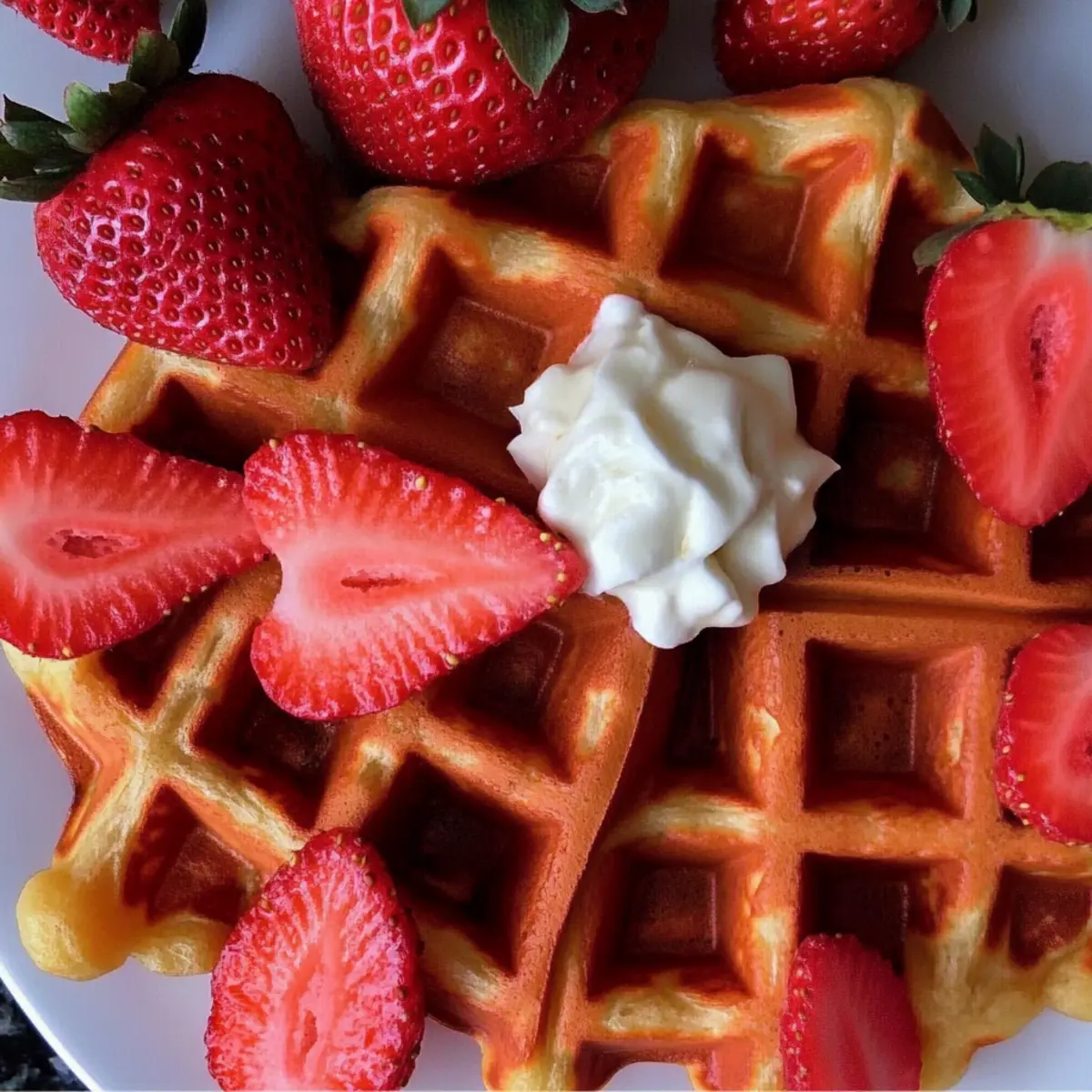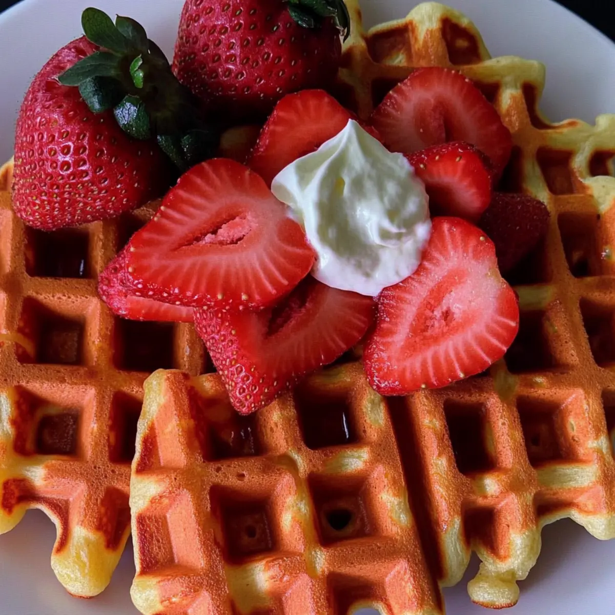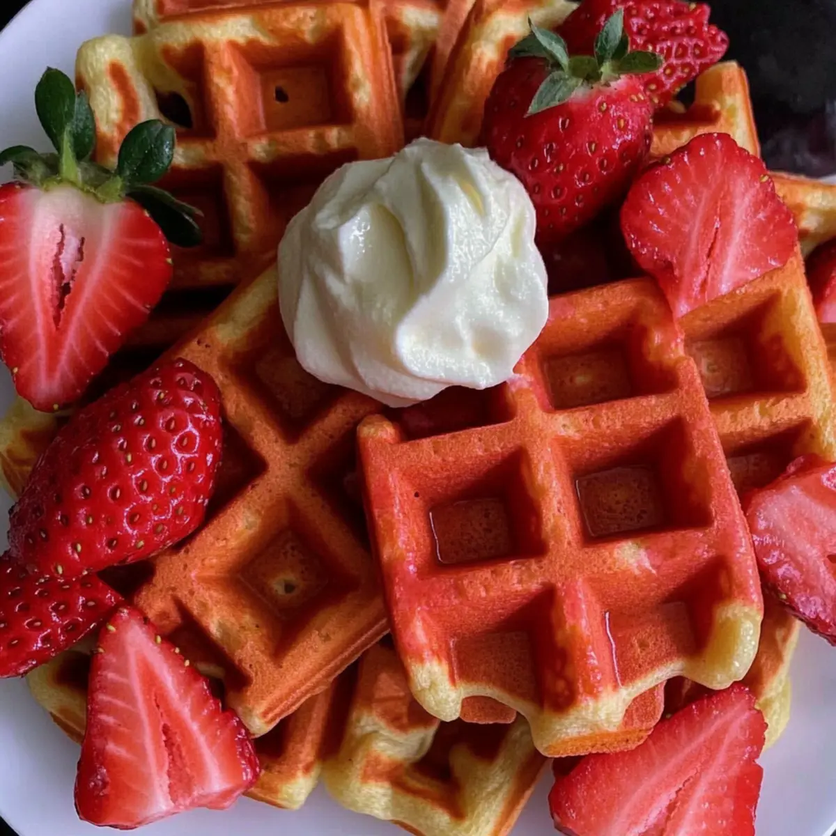 Jump to Recipe Print RecipeAs a unique twist on a breakfast favorite, these Strawberry Waffles are a delightful way to brighten your morning. Mixing fresh strawberries into a fluffy batter creates not just a beautiful pink-hued dish but also a texture that’ll have you dreaming of warm, sunny mornings. What I love best about this recipe is how quick it is—whip them up in just about 30 minutes for any occasion, whether it’s a busy weekday or a leisurely weekend brunch. Plus, the use of fresh ingredients makes these waffles a heartwarming treat that satisfies both your taste buds and your desire for healthier options. What toppings will you choose to elevate your waffle game today? Why are Strawberry Waffles the perfect breakfast? Freshness at its finest: Bursting with juicy strawberries, these waffles offer a delicious way to enjoy the season’s best fruit. Quick to make: In just 30 minutes, you’ll be savoring a breakfast that feels indulgent without taking all morning. Customization possibilities: Top with whipped cream, syrup, or even yogurt—there’s no wrong way to enjoy these! Healthy twist: The recipe can easily be adapted with whole grain flour and natural sweeteners, allowing you to indulge guilt-free. Crowd-pleaser: Perfect for brunch gatherings or cozy family breakfasts, these waffles are sure to impress everyone at your table! For more delightful fruit-inspired recipes, check out my Strawberry Crunch Cheesecake or try out some delicious Strawberry Mango Cupcakes. Strawberry Waffle Ingredients • Get ready to indulge in these fluffy Strawberry Waffles with fresh strawberries! For the Batter All-Purpose Flour – Provides structure to the waffles; you can substitute with whole wheat flour for a healthier twist. Sugar – Adds a touch of sweetness; consider using honey or maple syrup for a natural alternative. Baking Powder – This leavening agent ensures the waffles rise and become fluffy. Salt – Enhances the overall flavor of the batter. Milk – Adds moisture and richness; for a dairy-free version, try almond milk or your favorite milk alternative. Large Eggs – Binds the ingredients and helps achieve that delightful fluffiness; substitute with flaxseed or chia eggs for a vegan option. Melted Butter – Brings richness and flavor; you can use coconut oil for a dairy-free option. Fresh Strawberries – The star ingredient that adds both flavor and freshness; if needed, you can use frozen strawberries (just make sure they are thawed and drained well). Vanilla Extract – Infuses the batter with a warm, aromatic flavor that complements the strawberries beautifully. Feel free to dive into this delicious recipe and make your mornings a bit brighter with these irresistible Strawberry Waffles! Step‑by‑Step Instructions for Strawberry Waffles Step 1: Prepare Waffle Iron Preheat your waffle iron according to the manufacturer’s instructions, typically to a medium-high setting. While heating, lightly grease the plates with cooking spray or a brush of oil to prevent sticking. This step ensures your Strawberry Waffles will have that perfect crispy exterior! Step 2: Mix Dry Ingredients In a large mixing bowl, whisk together 1 ½ cups of all-purpose flour, 2 tablespoons of sugar, 1 tablespoon of baking powder, and ½ teaspoon of salt until combined. The ingredients should be uniform, with no lumps remaining. This mixture forms the structural base of your fluffy Strawberry Waffles. Step 3: Combine Wet Ingredients In another bowl, whisk together 1 ¼ cups of milk, 2 large eggs, ¼ cup of melted butter, and 1 teaspoon of vanilla extract until smooth. Once combined, the mixture should appear slightly frothy, indicating that it’s well blended and ready to join the dry ingredients for the Strawberry Waffles. Step 4: Combine Mixtures Gently pour the wet ingredients into the bowl with the dry ingredients, stirring until just combined. Be careful not to overmix; the batter should remain slightly lumpy for that light and fluffy texture. Next, fold in 1 cup of freshly pureed strawberries, adding vibrant color and fruity flavor to your batter. Step 5: Cook Waffles Once your waffle iron is heated and greased, pour an appropriate amount of batter onto the center of the iron, usually about ¾ cup, depending on your appliance’s size. Close the lid and cook for 4-5 minutes or until the waffles turn golden brown and crisp, providing a delicious aroma that fills your kitchen. Step 6: Serve Carefully remove the cooked Strawberry Waffles from the iron and place them on a warm plate. Top them with reserved fresh strawberries or your choice of delicious toppings like whipped cream or syrup. Enjoy these warm strawberry delights straight from the waffle maker for the best flavor and texture! Strawberry Waffles Variations & Substitutions Customize your strawberry waffles to suit your taste and dietary preferences with these fun ideas! Dairy-Free: Substitute milk with almond or oat milk, and use coconut oil instead of butter for a fantastic dairy-free option. You’ll still enjoy the same great texture and flavor! Whole Wheat: Swap all-purpose flour for whole wheat flour for a healthier, heartier version. Just remember, this might give your waffles a slightly denser texture. Natural Sweeteners: Use honey or maple syrup instead of granulated sugar for a lovely, natural sweetness that pairs beautifully with the strawberries. Add Chocolate Chips: For an indulgent twist, fold in some chocolate chips into the batter before cooking. The gooey goodness will make your waffles truly irresistible! Flavor Boost: Mix in a teaspoon of cinnamon for an extra hint of warmth, complementing the strawberries beautifully. It’s like a cozy hug in every bite! Nutty Texture: Add chopped walnuts or almonds for a satisfying crunch—this nutty addition contrasts beautifully with the soft waffles. Frozen Strawberries: Can’t find fresh strawberries? Use thawed frozen strawberries instead, but make sure to drain them 