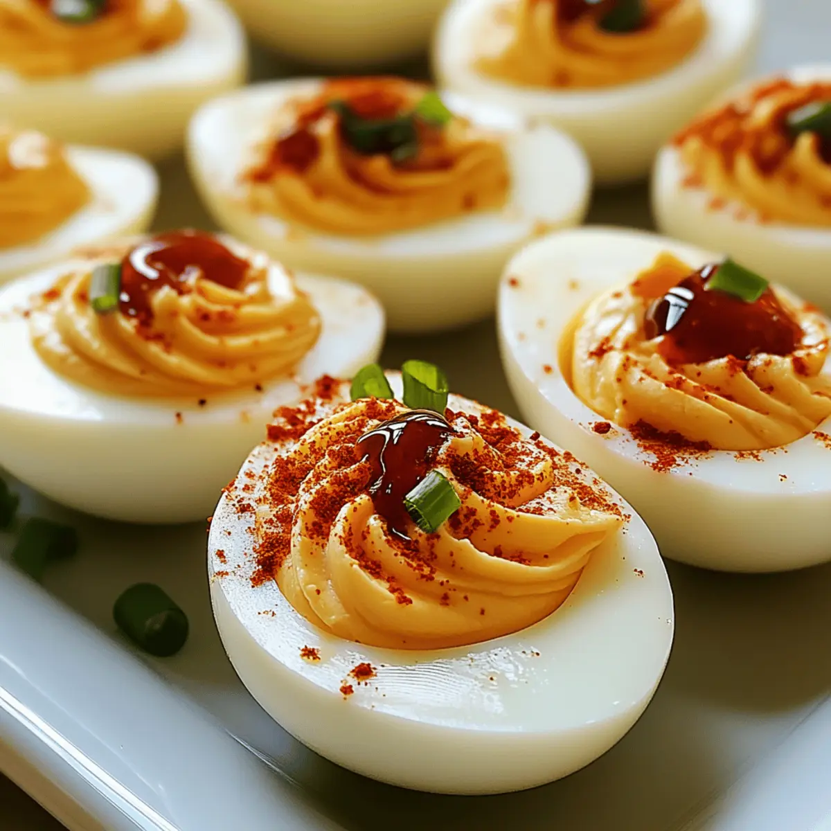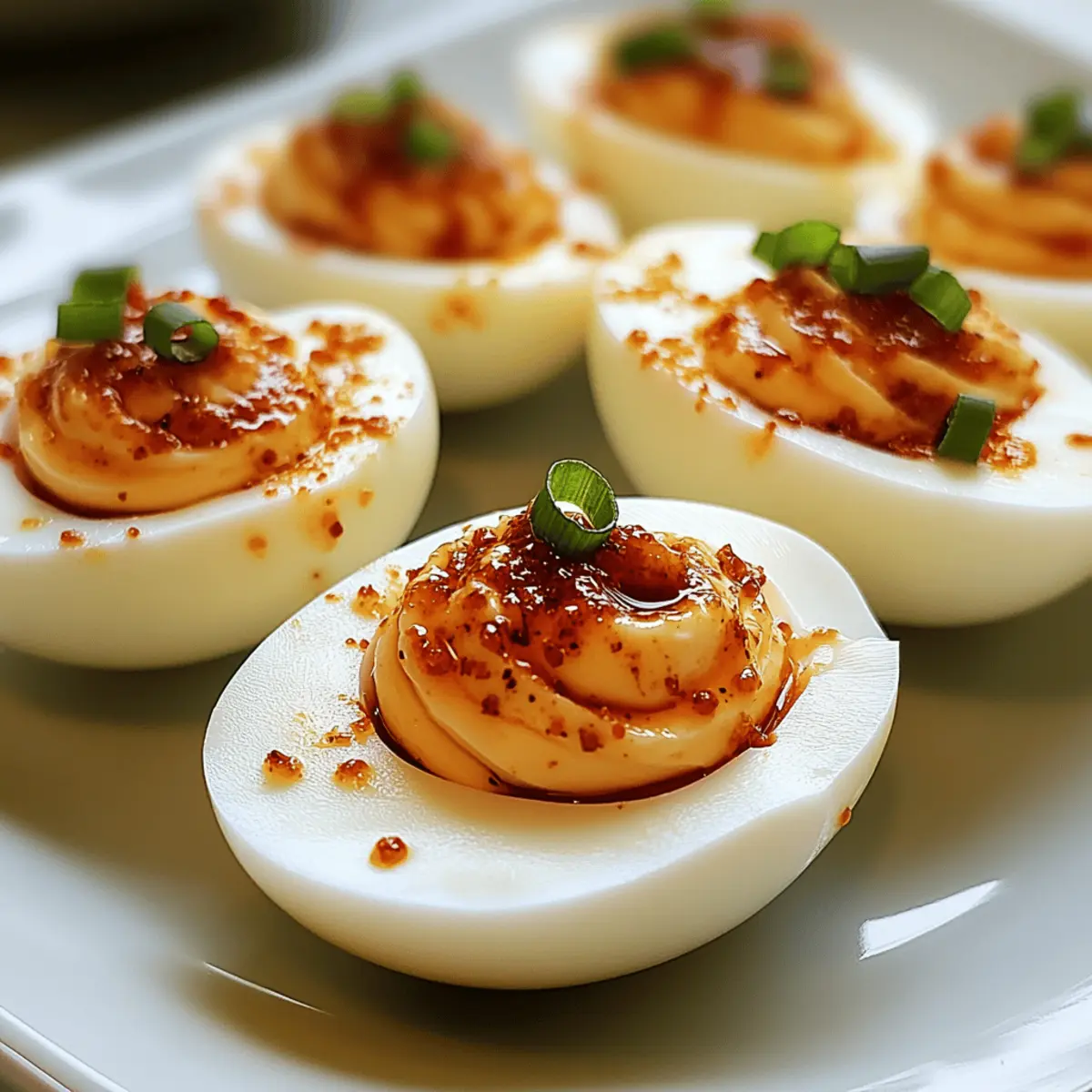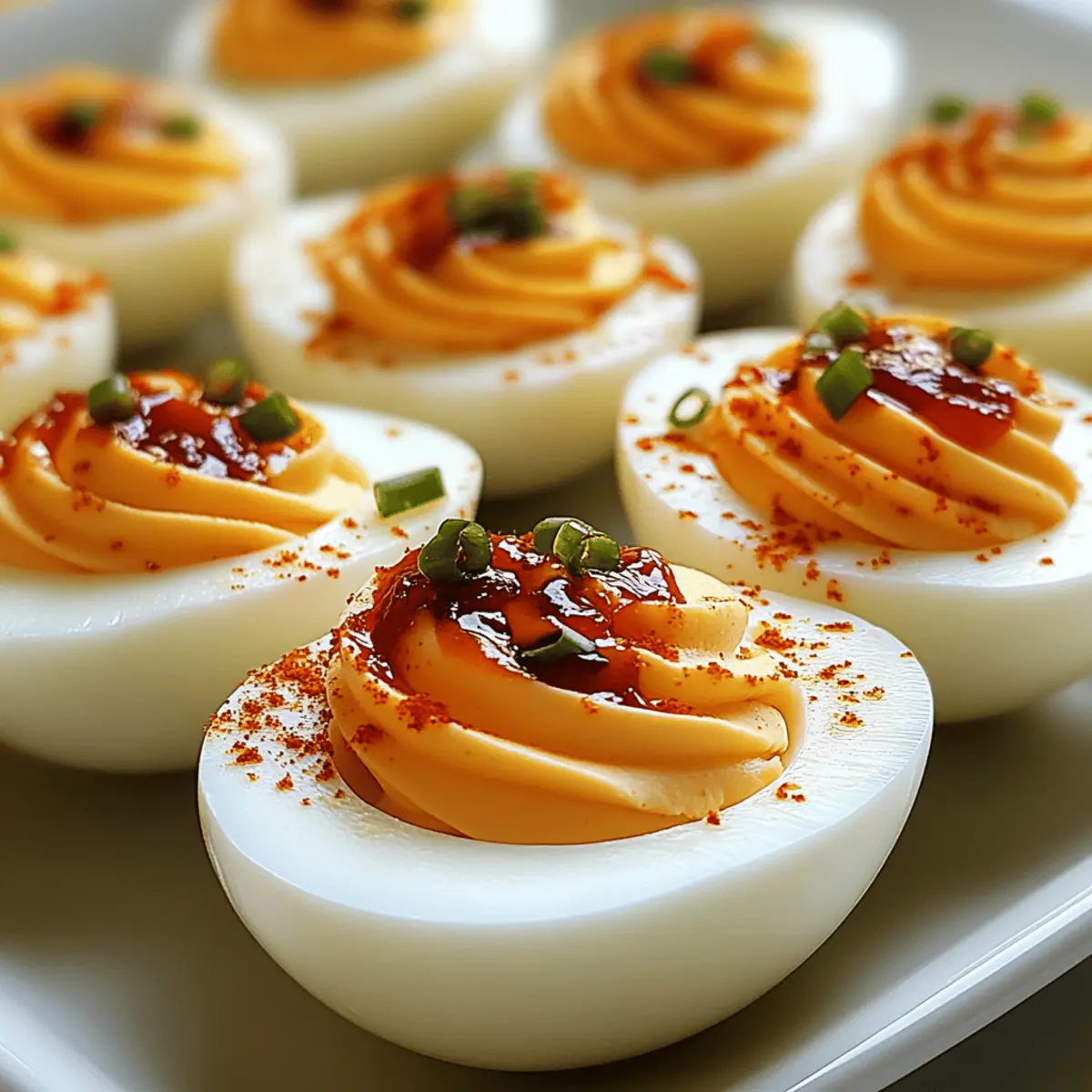 Jump to Recipe Print RecipeAs I stood in my kitchen, the sweet and tangy aroma of pepper jelly filled the air, instantly igniting memories of summer barbecues and family gatherings. These Sweet and Spicy Pepper Jelly Deviled Eggs bring a delightful twist to the classic appetizer, combining creamy yolks with a lively kick that your taste buds will adore. Not only are they a snap to prepare, making them a perfect choice for unexpected guests, but they also cater to gluten-free and low-carb diets. Every bite offers a hint of Southern charm that’s bound to impress, whether at a festive brunch or a casual picnic. Are you ready to elevate your appetizer game? Let’s dive into this vibrant recipe! Why are these deviled eggs special? Unique Flavor: These Sweet and Spicy Pepper Jelly Deviled Eggs boast a delightful blend of heat and sweetness that will leave your guests raving. Quick & Easy: With a simple preparation process, you won’t waste hours in the kitchen—perfect for those spontaneous gatherings. Health-Conscious: Gluten-free and low-carb, these deviled eggs are great for everyone, including those watching their diets. Versatile: Customize your dish by adding smoked paprika or crumbled bacon for extra flair. Plus, they pair perfectly with mimosas or as part of a charcuterie board! Crowd-Pleaser: Their vibrant colors and exciting taste make them an instant hit at any party, similar to our delicious Parmesan Deviled Eggs or even Sweet Potato Rounds. Prepare to impress! Sweet and Spicy Pepper Jelly Deviled Eggs Ingredients For the Filling • Eggs – Fresh eggs provide rich flavor and structure, making them perfect for boiling without cracking. • Mayonnaise – This creamy ingredient adds moisture; Greek yogurt can be a healthier substitute! • Dijon Mustard – Tangy and flavorful, it enhances the filling; feel free to use regular mustard if that’s what you have on hand. • Sweet and Spicy Pepper Jelly – This is the star ingredient that adds a unique sweet heat to your deviled eggs. • Apple Cider Vinegar – It brings acidity to balance the creamy filling; white vinegar can be used if needed. • Salt & Pepper – Essential seasonings to enhance the overall taste, adjust according to your preference. • Smoked Paprika (optional) – Adds a subtle smoky flavor; omit if you don’t have it on hand or prefer a milder taste. For Garnish • Chives/Green Onions – Fresh herbs that add color and a hint of freshness; dill can be a lovely alternative. Feel free to make these Sweet and Spicy Pepper Jelly Deviled Eggs your own by experimenting with different herbs or spice levels! Step‑by‑Step Instructions for Sweet and Spicy Pepper Jelly Deviled Eggs Step 1: Boil the Eggs Place fresh eggs in a saucepan and cover them with cold water, ensuring the water is about an inch above the eggs. Bring the water to a rolling boil over medium heat, then reduce to a simmer. Once boiling, cover the saucepan, remove it from the heat, and let it sit for 10-12 minutes for perfectly cooked yolks. Step 2: Chill the Eggs After the cooking time is complete, carefully transfer the eggs to an ice bath using a slotted spoon. Let the eggs cool for about 5 minutes; this process not only halts cooking but also helps in easier peeling. You’ll know they’re ready when they feel cool to the touch, making them easy to handle. Step 3: Peel and Halve the Eggs Once chilled, gently tap each egg on the counter to crack the shell, then peel under running water if needed to help remove stubborn pieces. Slice each egg in half lengthwise, using a sharp knife for clean cuts. Set the egg white halves on a serving platter, ready for the delicious filling. Step 4: Prepare the Filling Scoop the yolks into a mixing bowl and mash them with a fork until smooth. Add mayonnaise, Dijon mustard, sweet and spicy pepper jelly, apple cider vinegar, salt, and pepper to the bowl. Mix everything well until you achieve a creamy and flavorful filling that highlights the unique taste of Sweet and Spicy Pepper Jelly Deviled Eggs. Step 5: Fill the Egg Whites Using a spoon or a piping bag, carefully fill each egg white half with the creamy yolk mixture. If using a piping bag, you can create beautiful swirls for an impressive presentation. Ensure each egg is generously filled, complementing the firm egg whites with the rich filling. Step 6: Garnish and Serve Top each filled egg with a dollop of additional sweet and spicy pepper jelly, and if desired, sprinkle with smoked paprika for that extra touch of flavor. Finally, add a sprinkle of fresh chives or green onions for a burst of color and freshness. Serve immediately, or chill until ready to impress your guests! How to Store and Freeze Sweet and Spicy Pepper Jelly Deviled Eggs Fridge: Store any leftover Sweet and Spicy Pepper Jelly Deviled Eggs in an airtight container for up to 3 days for optimal freshness. Make-Ahead: You can prepare these deviled eggs a few hours in advance; just keep the filling separate from the egg whites until serving to maintain their texture. Freezer: These deviled eggs do not freeze well due to the creamy filling, which may separate upon thawing. It’s best to enjoy them fresh! Serving After Storage: If refrigerated, simply serve cold, or allow them to sit at room temperature for about 20 minutes before serving for best flavor. Expert Tips for Sweet and Spicy Pepper Jelly Deviled Eggs Freshness Matters: Use the freshest eggs possible for the best results. They peel easier and yield a smoother filling for your Sweet and Spicy Pepper Jelly Deviled Eggs. Boiling Precision: Keep a close watch on boiling time. Overcooking can create a greenish hue around the yolks, which may affect the appearance without impacting taste. Customize Your Heat: If you prefer a little more spice, experiment with various brands of pepper jelly to find your ideal sweetness and heat level for the filling. Creamy Consistency: For an ultra-smooth texture, ensure you mix the yolks thoroughly