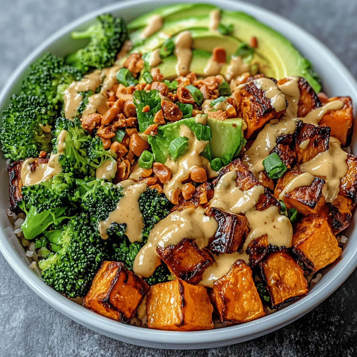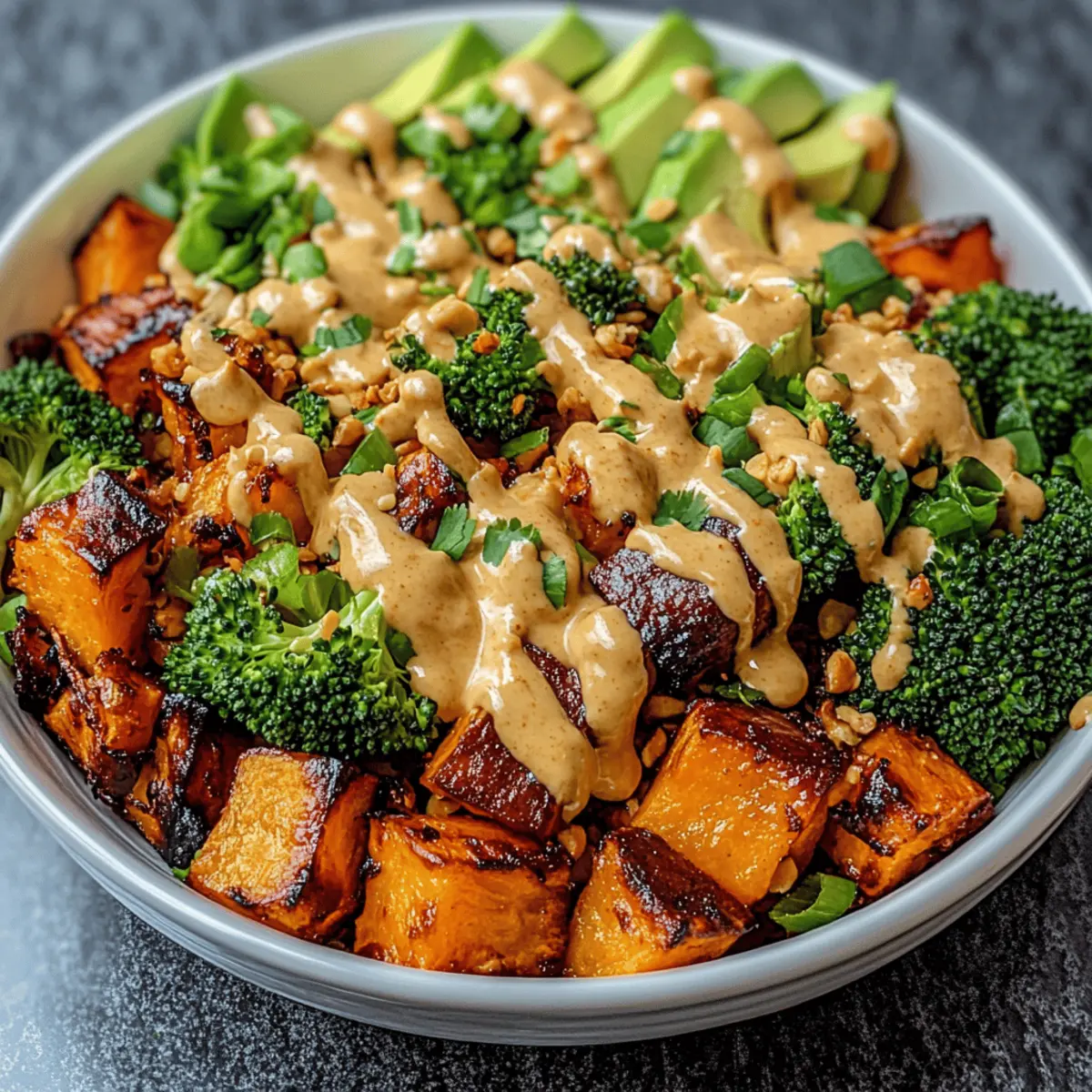 While the sweet potatoes roast, take a large mixing bowl and combine the chopped broccoli florets, shredded cabbage, grated carrots, and sliced avocado. Toss the ingredients gently, allowing the vibrant colors to blend together. This medley will add a delightful crunch and freshness to your Thai Peanut Sweet Potato Buddha Bowl.