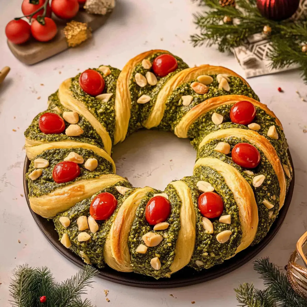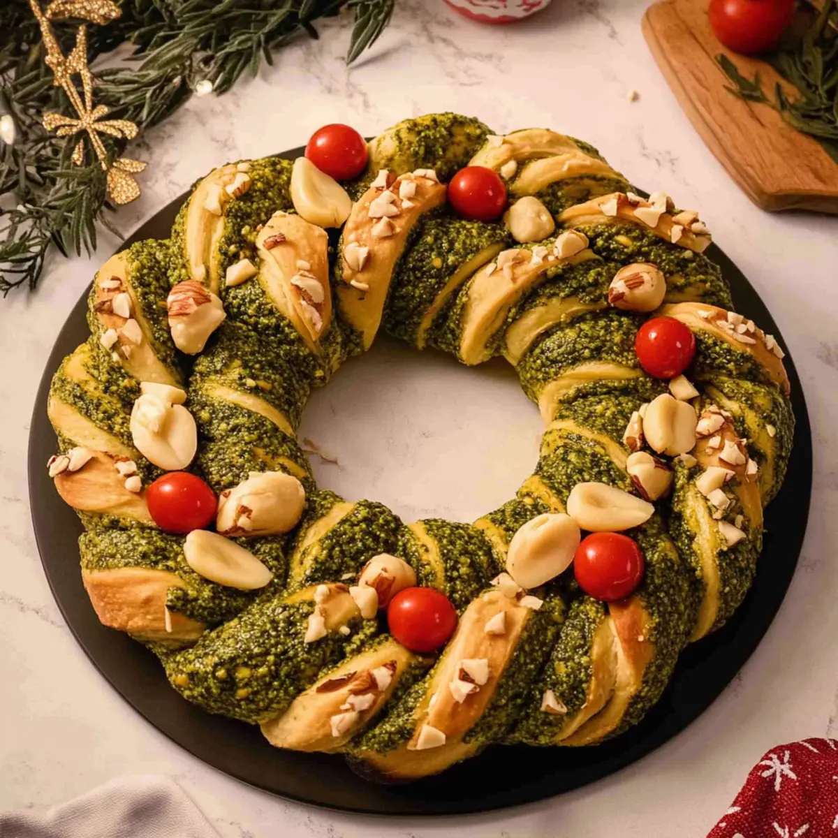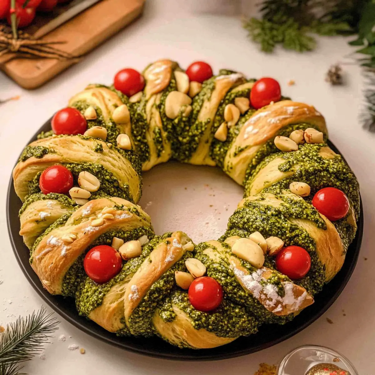 Jump to Recipe Print RecipeAs the aroma of baking bread fills the air, there’s something magical that happens in the kitchen. I can’t help but feel the excitement rise, especially when creating this Vegan Pesto Bread Wreath. A stunning centerpiece for your festive gatherings, this wreath is not only a feast for the eyes but also a crowd-pleaser. With its fluffy, brioche-like texture and rich macadamia pesto filling, it satisfies cravings while keeping things plant-based and delicious. Plus, it’s surprisingly simple to make—perfect for both seasoned chefs and those newly enchanted by the art of baking. So, whether you’re hosting a holiday party or simply want to elevate your family dinner, this Vegan Pesto Bread Wreath is sure to impress. Ready to dive into a baking adventure? Why is this Vegan Pesto Bread Wreath special? Show-Stopping Centerpiece: The beautiful braided design of this wreath not only catches the eye but also ignites excitement at any gathering. Delicious Flavor Fusion: Combining macadamia nut pesto with fluffy bread creates a savory explosion in every bite. Plant-Based Perfection: Vegan and wholesome, it’s ideal for everyone, even those with dietary restrictions. Simple Techniques: Achieve bakery-quality results easily, making it perfect for beginner bakers and culinary pros alike. Endless Variations: Feel free to swap in different herbs or nuts, allowing you to customize this dish based on personal taste. For more plant-based inspiration, check out my recipes on vegan appetizers or quick bread! Vegan Pesto Bread Wreath Ingredients For the Pesto Macadamia Basil Pesto – Provides the flavor base for the filling; substitute with walnuts or pine nuts if desired. Basil Leaves – Key green herb component; substitute half with other herbs or leafy greens for variation. Australian Macadamias – Adds a creamy texture; can be replaced with any other nut. Lemon Juice – Enhances flavor; adjust to taste. Nutritional Yeast – Offers a cheesy flavor; omit for dairy-free options or substitute with vegan cheese. Garlic – Adds depth; use fresh or powder based on preference. For the Dough All-Purpose Flour or Bread Flour – Provides structure; choose based on availability. Dairy-Free Milk – Hydrates the dough; any plant-based milk can be used. Vegan Butter – Enriches the dough; spreadable vegan butter works as well. Granulated Sugar – Aids in browning and yeast activation; can be omitted for no-sugar diets. Instant Dry Yeast – A quick-acting yeast; regular yeast can be used if proofed first. Dried Herbs (e.g., oregano, rosemary) – For flavoring the dough; mix to personal taste. Salt – Enhances all flavors; adjust if using salted butter. For Finishing Touches Melted Vegan Butter – For glazing the finished wreath. Whole and Crushed Macadamia Nuts & Cherry Tomatoes – For decoration and added crunch. This Vegan Pesto Bread Wreath is not only a feast for the senses but also packed with nutritious ingredients that showcase the wonders of plant-based cooking! Step‑by‑Step Instructions for Vegan Pesto Bread Wreath Step 1: Make the Pesto Begin by preparing your macadamia basil pesto. If desired, toast the macadamias in a pan over medium heat for about 5 minutes until fragrant. In a food processor, blend the toasted macadamias, fresh basil leaves, lemon juice, nutritional yeast, garlic, salt, and a drizzle of olive oil until the mixture is smooth and creamy. Set your flavorful pesto aside for later use. Step 2: Prepare the Dough In a large mixing bowl or stand mixer, combine the all-purpose flour, dairy-free milk, vegan butter, granulated sugar, instant dry yeast, dried herbs, and salt. Mix the ingredients together until a sticky dough forms, then knead the dough for about 5-10 minutes until it becomes soft and elastic. The Vegan Pesto Bread Wreath’s dough should feel smooth and slightly tacky. Step 3: First Rise Once the dough is ready, place it in a lightly greased bowl and cover it with a clean tea towel. Let it rise in a warm, draft-free area for 1-2 hours, or until it doubles in size. This is crucial for the texture of your Vegan Pesto Bread Wreath, so be patient and ensure that the dough feels puffy and airy. Step 4: Assemble the Wreath After the dough has risen, turn it out onto a floured surface and roll it into a large rectangle. Spread the prepared macadamia pesto evenly over about two-thirds of the dough, leaving a small border. Carefully fold the unpestoed portion over the filled part, creating a layered effect, then cut the dough into strips about 1 inch wide and twist each strip to create a braid. Step 5: Shape the Wreath Next, take the braided strips and form them into a circular wreath shape, pinching the ends to seal. Place the wreath onto a lined baking sheet and cover it again with a towel. Allow the wreath to rest in a warm spot for another hour, ensuring it puffs up and looks inviting before baking. Step 6: Bake Preheat your oven to 180°C (350°F). Once ready, bake the wreath for 25-30 minutes until it turns a lovely golden brown and sounds hollow when tapped on the bottom. Keep an eye on it to avoid over-browning; if necessary, cover it loosely with foil during the last few minutes of baking. Step 7: Decorate and Serve As soon as your Vegan Pesto Bread Wreath is done baking, brush it with melted vegan butter for a glossy finish. Sprinkle with whole and crushed macadamia nuts and cherry tomatoes for that festive touch. Allow it to cool slightly before slicing and serving, sharing this delightful centerpiece with family and friends. Tips for the Best Vegan Pesto Bread Wreath Perfect Yeast Activation: Ensure your yeast activates at the right temperature; it should be warm, around 24-25°C, for optimal dough rise. Avoid Dough Cracks: Keep your dough at a comfortable warm temperature while rising to prevent it from cracking due to chill. Serve Fresh: For the best taste, serve the Vegan Pesto Bread Wreath warm or slightly reheated to highli