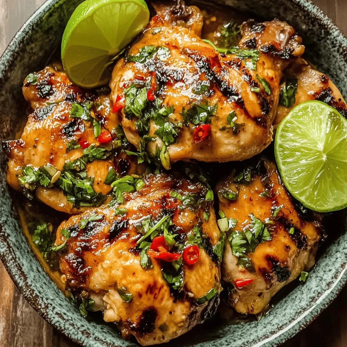 5. Remove the chicken thighs from the skillet and let them rest for a few minutes. Slice the chicken and arrange on a serving platter, garnishing with fresh cilantro and lime wedges.
