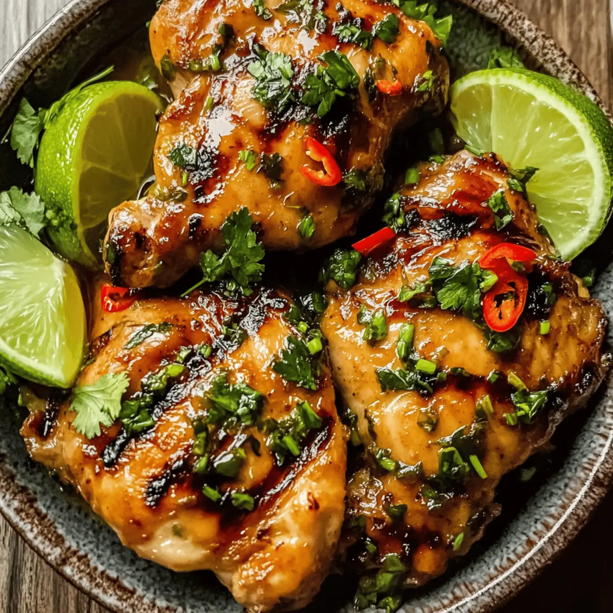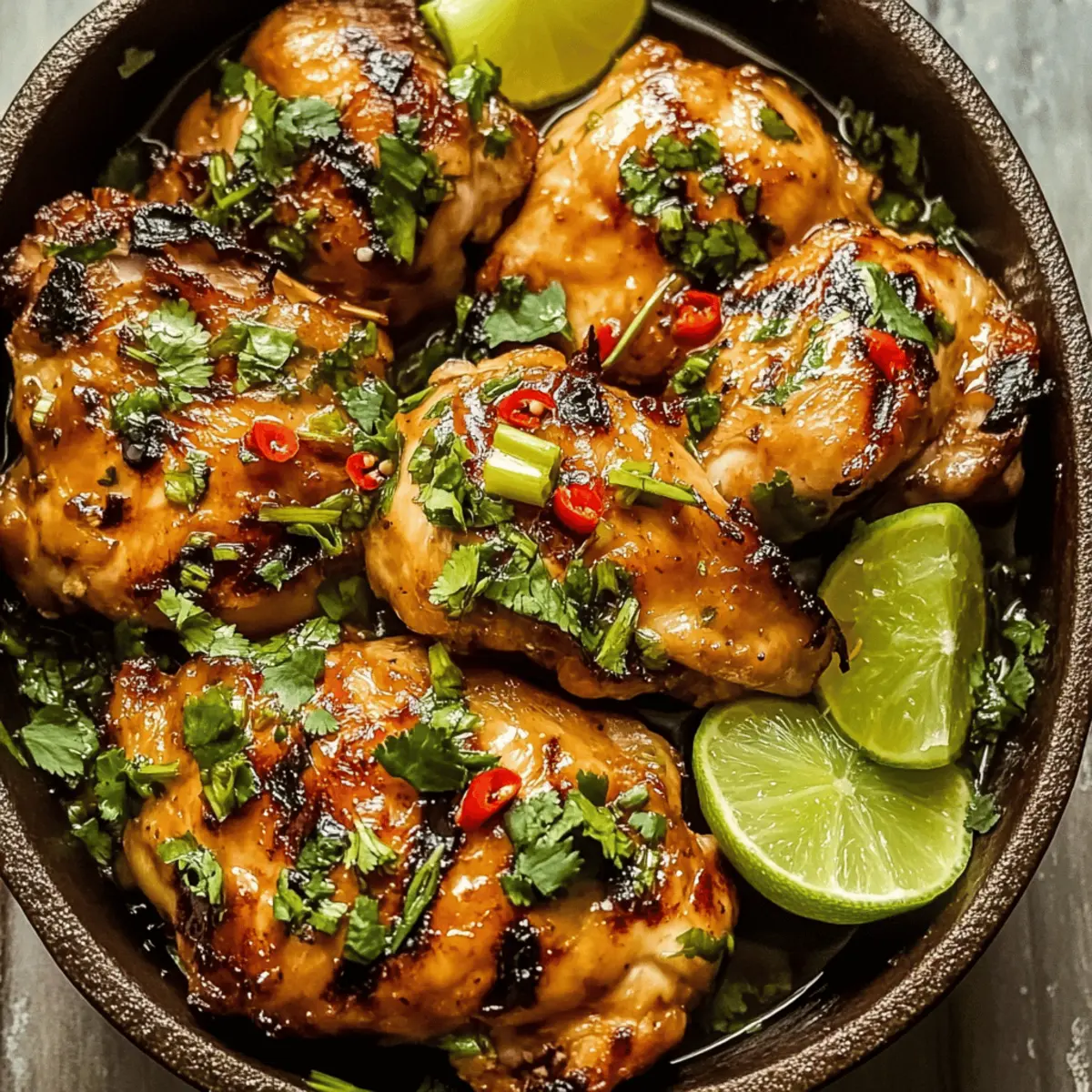 Once cooked, remove the chicken thighs from the skillet and let them rest for a few minutes on a cutting board. This resting period allows the juices to redistribute, ensuring savory bites. After resting, slice the chicken and arrange on a serving platter, garnishing with fresh cilantro and lime wedges for an extra burst of flavor, completing the Vietnamese Lemongrass Chicken experience.