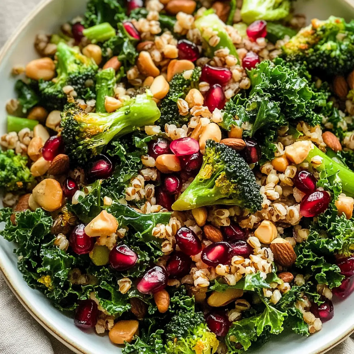 Jump to Recipe Print RecipeAs I stood in my kitchen, the crisp winter air danced through the window, hinting at cozy evenings and hearty meals. One of my favorite go-to recipes to warm both body and soul is the Winter Farro & Kale Salad. This vibrant dish combines chewy farro with protein-rich chickpeas and the delightful sweetness of pomegranate seeds, all perfectly drizzled with a zesty garlic citrus dressing. Not only is it an easy meal prep option that can be whipped up in advance, but it’s also a wonderfully nourishing bowl of goodness for those light dinners on chilly nights. The seasonal ingredients bring both comfort and nutrition, making this salad a true delight. Curious how you can transform simple grains and greens into a standout meal? Let’s dive into this recipe together! Why Is This Salad Perfect for Winter? Versatile Ingredients: The Winter Farro & Kale Salad allows creativity in substitutions, whether you prefer adding roasted sweet potatoes for extra warmth or swapping chickpeas for black beans for a twist. Nutrient-Packed: With hearty farro as the base, this salad is a powerhouse of protein and fiber, ensuring you stay energized throughout your day. Easy Meal Prep: Perfectly suited for busy weekdays, this salad can be prepared in advance, making healthy eating a breeze! Store it in the fridge for up to five days. Flavor Explosion: The zesty garlic citrus dressing ties everything together, enhancing the fresh, vibrant flavors of the vegetables and grains. Crowd Pleaser: Whether served at a family gathering or a cozy dinner, this salad impresses with its colorful presentation and comforting taste, akin to a warm grain bowl. Don’t miss out on fantastic salad ideas; for a tropical twist, check out my Peach Feta Salad or enjoy the refreshing flavor of the Summer Berry Salad on warm days! Winter Farro & Kale Salad Ingredients For the Base Farro – Provides a chewy texture and is high in protein and fiber; for a gluten-free option, try quinoa or brown rice instead. Kale – Offers heartiness and essential nutrients; lactino kale is preferred, but spinach can replace it if added just before serving. Chickpeas – Adds plant-based protein and creaminess to the salad; substitute with lentils or tofu for a different texture. For the Vegetables Broccoli – Gives a satisfying crunch while being nutrient-dense; feel free to swap with Brussels sprouts or cauliflower for taste variation. Red Onion – Enhances flavor and adds vibrant color; shallots or yellow onions work well as substitutes. For the Dressing Olive Oil – A base for the dressing that adds richness; you can use a flavored oil for a unique twist. Lemon Juice – Fresh and zesty, it brightens the salad; use lime juice for a different citrus flavor. Minced Garlic – Adds depth and a savory kick to the dressing; garlic powder can be used in a pinch. Mustard – Provides a tangy punch; Dijon is ideal, but yellow mustard can work too. Red Pepper Flakes – For a mild heat; omit if desired, or replace with a dash of black pepper. Oregano – Gives an aromatic flavor; dried Italian herbs can be a great alternative. For the Toppings Pepitas – Adds crunch and a nutty flavor; sunflower seeds serve as a delicious alternative. Pomegranate Seeds – Offer a delightful sweetness and visual appeal; consider dried cranberries for a different sweet note. This Winter Farro & Kale Salad is not only a deliciously hearty meal, but it’s also versatile and perfect for meal prep, ensuring you enjoy wholesome eating all week long! Step‑by‑Step Instructions for Winter Farro & Kale Salad Step 1: Cook the Farro Begin your Winter Farro & Kale Salad by bringing a large pot of salted water to a boil. Add in 1 cup of farro and reduce the heat to a gentle simmer. Cook uncovered for about 15-17 minutes, or until the farro is tender yet chewy. Once done, drain it well and spread the grains on a baking sheet to cool while you prepare the rest of your ingredients. Step 2: Roast the Vegetables While the farro is cooling, preheat your oven to 425°F (220°C). On a baking tray, combine chopped broccoli and thinly sliced red onion with olive oil and your choice of herbs and spices. Toss together until the veggies are well-coated. Roast in the oven for about 20 minutes, or until the broccoli is tender and lightly browned, then set aside to cool slightly. Step 3: Prepare the Dressing In a medium jar, combine 1/4 cup of olive oil, the juice of one lemon, minced garlic, Dijon mustard, red pepper flakes, and dried oregano. Seal the jar tightly and shake vigorously for about 30 seconds until the mixture is well blended and emulsified. This zesty dressing will brighten your Winter Farro & Kale Salad and bring all the flavors together. Step 4: Massage the Kale In a large bowl, add the chopped kale (lactino kale is recommended for this salad). Drizzle a small amount of your prepared dressing over the kale and massage the leaves gently with your hands for about 2-3 minutes, until they begin to soften and darken in color. This step makes the kale more palatable and sweetens its flavor. Step 5: Assemble the Salad Now it’s time to bring your Winter Farro & Kale Salad together! To the massaged kale, add the cooled farro, roasted broccoli, red onion, and drained chickpeas. Pour the remaining dressing over the entire salad and toss gently until all ingredients are well combined and coated. The vibrant colors and textures should create an inviting bowl of nourishment. Step 6: Add Toppings and Serve Finally, sprinkle the salad with pepitas and pomegranate seeds for an extra crunch and burst of sweetness. Give the salad one last gentle toss to distribute the toppings evenly. Serve immediately for the best texture, or let it chill in the refrigerator for 15-30 minutes to enhance the flavors before serving. Enjoy your delicious Winter Farro & Kale Salad! How to Store and Freeze Winter Farro & Kale Salad Fridge: Store the Winter Farro & Kale Salad in an airtight 