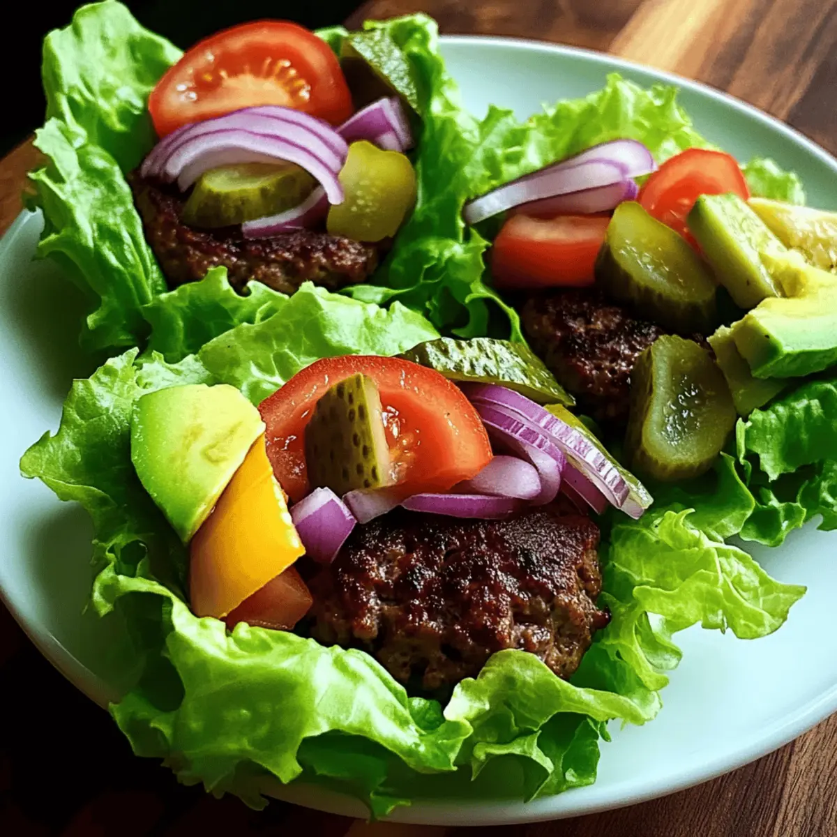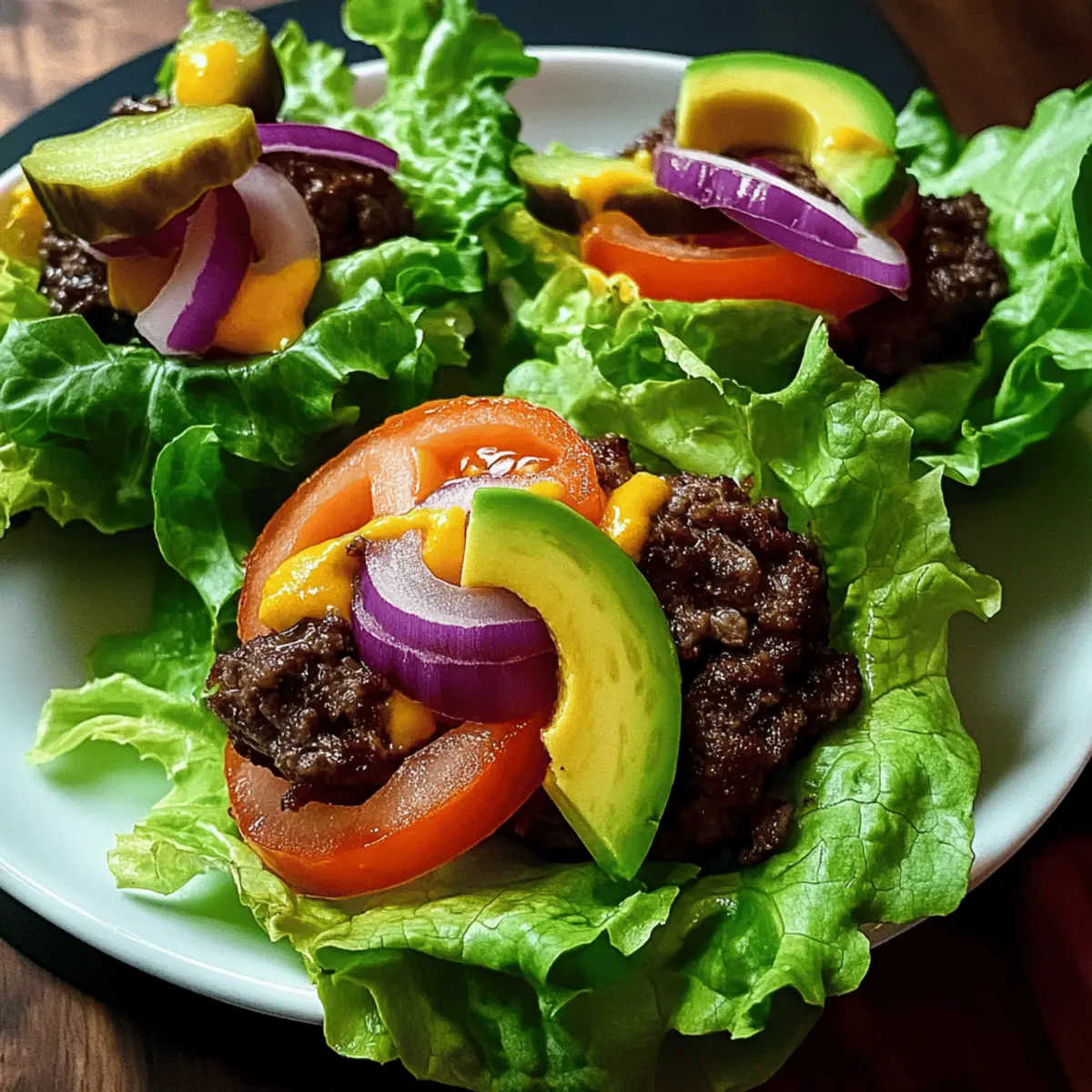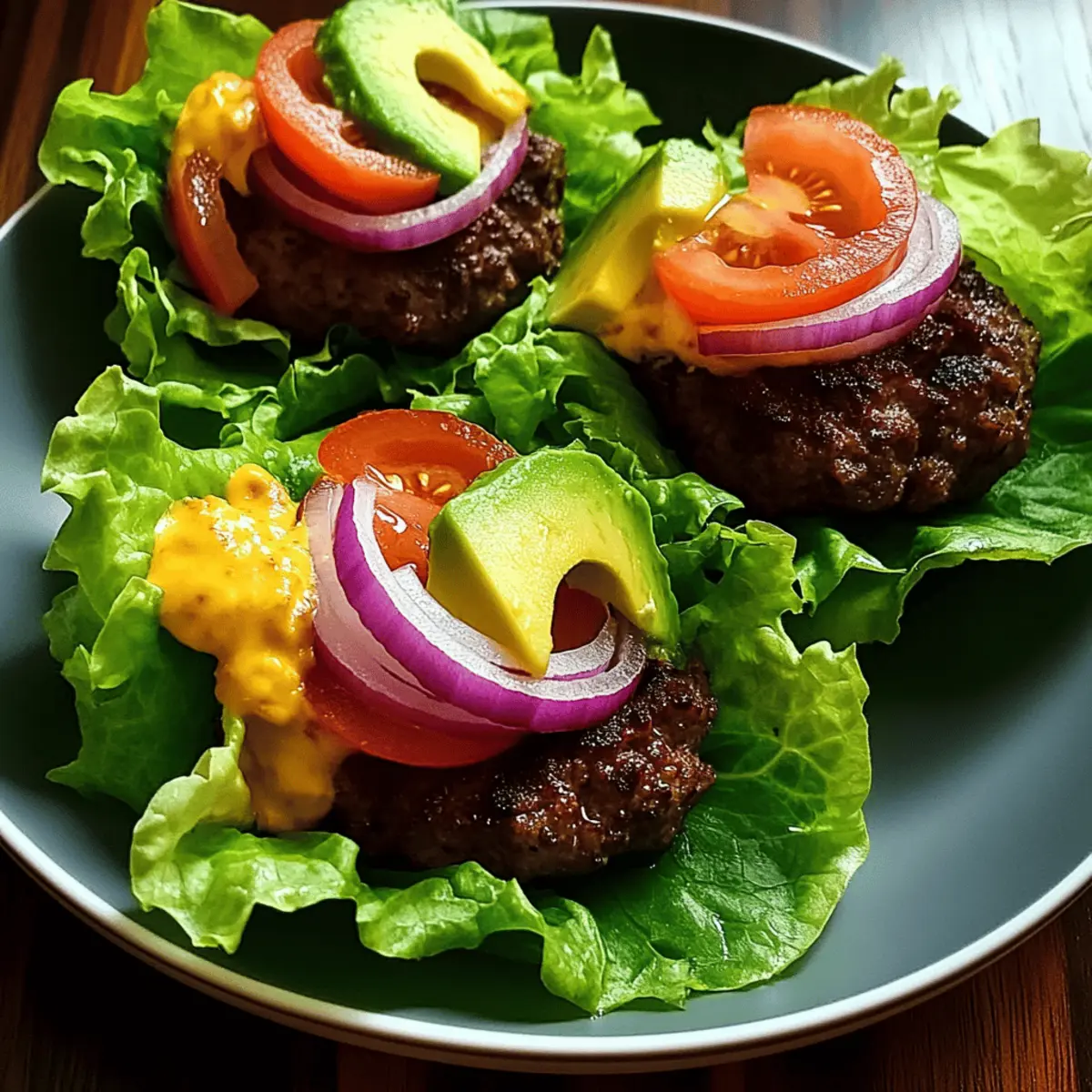 Jump to Recipe Print RecipeThe sizzle of meat on the grill always gets my heart racing, but when I’m craving something a bit lighter, nothing beats the vibrant crunch of lettuce wrap burgers. These delightful handheld creations take the classic burger experience and swap the heavy bun for crisp lettuce leaves, making them a low-carb and gluten-free option that feels completely indulgent without the guilt. With perfectly seasoned beef patties, juicy tomatoes, and creamy avocado all neatly wrapped in a refreshing layer of greenery, these burgers promise to satisfy your cravings while keeping things healthy. Plus, they come together in a snap—ideal for busy weeknights or casual gatherings with friends. Are you ready to turn your dinner routine upside down? Let’s dive in! Why are Lettuce Wrap Burgers a Game Changer? Health-conscious Delight: These burgers transform your favorite meal into a low-carb, gluten-free option that doesn’t skimp on flavor. Quick and Easy: Perfect for busy weeknights, this recipe comes together in just a few simple steps, making dinner stress-free. Fresh Ingredients: Crisp lettuce, juicy tomatoes, and creamy avocado create a refreshing burst of flavor in every bite. Crowd Pleaser: Impress your family or guests with a guilt-free twist on a classic that they’ll adore. Pair it with a colorful slaw for extra crunch or baked sweet potato fries for a satisfying meal! Customizable Toppings: Feel free to experiment with toppings—whether it’s crispy bacon or your favorite herbs, make it your own! These Lettuce Wrap Burgers are not only a feast for your taste buds but also a wonderful option for health-focused diners. For more delicious and quick recipes, check out our Greek Chicken Burgers or Ranch Snack Wrap. Wrap Burgers Ingredients Enjoy making delicious wrap burgers with these fresh essentials! For the Patties Ground Beef (80% lean, 20% fat) – Provides flavor and juiciness; feel free to swap it for ground turkey or chicken for a leaner option. Salt – Enhances the natural flavors; adjust based on dietary needs. Black Pepper – Adds a sharp kick; freshly ground is preferred for maximum flavor. Garlic Powder – Imparts a deep, savory flavor without overpowering. Onion Powder – Contributes sweet and earthy notes. Worcestershire Sauce – Adds umami depth and a touch of tanginess. For the Wrap Lettuce (Butter or Iceberg) – Serves as the “bun,” offering a crisp and refreshing crunch; choose larger leaves for better wrap integrity. Cheddar Cheese (optional) – Melts into a creamy layer atop the burger. For Toppings Tomato (sliced) – Brightens with juicy sweetness. Red Onion (sliced) – Adds a sharp crunch. Avocado (sliced) – Contributes richness and creaminess. Pickles (sliced) – Introduces tangy acidity to balance flavors. Condiments (ketchup, mustard, mayonnaise) – Customize flavor to personal preference. For Grilling Olive Oil – Prevents sticking while grilling; a must for perfecting those tasty wrap burgers! Step‑by‑Step Instructions for Wrap Burgers Step 1: Prepare the Patty Mixture In a large bowl, combine the ground beef, salt, black pepper, garlic powder, onion powder, and Worcestershire sauce. Gently mix these ingredients with your hands until just combined, being careful not to overmix. This will keep your patties tender and juicy. Set the mixture aside while you prepare the grill. Step 2: Shape the Patties Divide the beef mixture into four equal portions and shape them into patties, each about ¾-inch thick. Make a slight indentation in the center of each patty to prevent them from puffing up while cooking. This step is key to ensuring evenly cooked wrap burgers that maintain their juicy flavor. Step 3: Preheat the Grill Preheat your grill or grill pan to medium-high heat, around 375°F to 400°F. Lightly brush the grill grates with olive oil to prevent sticking—this also helps achieve nice grill marks on your patties. You’ll know the grill is ready when you see a shimmering effect on the surface of the oil. Step 4: Grill the Patties Carefully place the patties on the preheated grill and let them cook for 3–4 minutes. Avoid moving them around; this allows for a beautiful sear. Flip the patties and grill for another 3–4 minutes, or until they reach your desired doneness. If using cheese, add it during the final minute of cooking to melt perfectly. Step 5: Prepare the Lettuce Wraps While the patties are grilling, rinse the lettuce leaves under cold water and gently dry them using a clean kitchen towel or paper towels. Choose large, sturdy leaves to serve as your wraps, ensuring they can hold the filling without tearing. This adds a refreshing crunch to your wrap burgers. Step 6: Assemble the Wrap Burgers Once the patties are cooked, place each patty on a lettuce leaf. Layer generous slices of tomato, red onion, avocado, and pickles on top of the patty. Customize your wrap burgers by adding your favorite condiments, like ketchup, mustard, or mayonnaise, to elevate the flavors even further. Step 7: Wrap It Up To wrap your burger, fold the sides of the lettuce leaf over the filling and then roll it up from the bottom to secure everything inside. This keeps your wrap burger intact, making it easy to hold and enjoy. Ensure each wrap is snugly secured for the best bite experience. Step 8: Serve and Enjoy Serve your delicious wrap burgers immediately with extra lettuce leaves and a selection of condiments on the side. The contrast of the crispy lettuce with the juicy beef and creamy toppings makes for a delightful meal. Gather your family or friends, and enjoy these healthy and satisfying wrap burgers together! What to Serve with Lettuce Wrap Burgers Nothing complements the vibrant freshness of lettuce wrap burgers quite like a thoughtful array of sides and beverages! Colorful Asian Slaw: A crunchy mix of cabbage, carrots, and sesame dressing adds a zesty contrast that brightens your meal. Sweet Potato Fries: Crispy, sweet, a